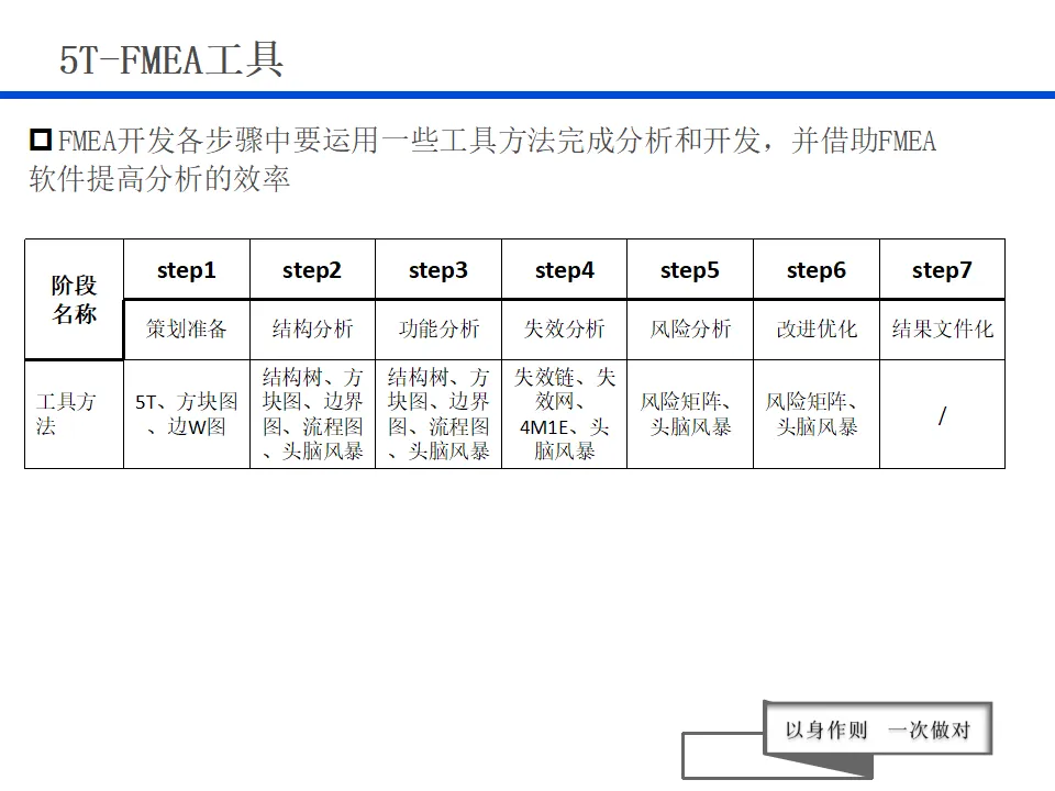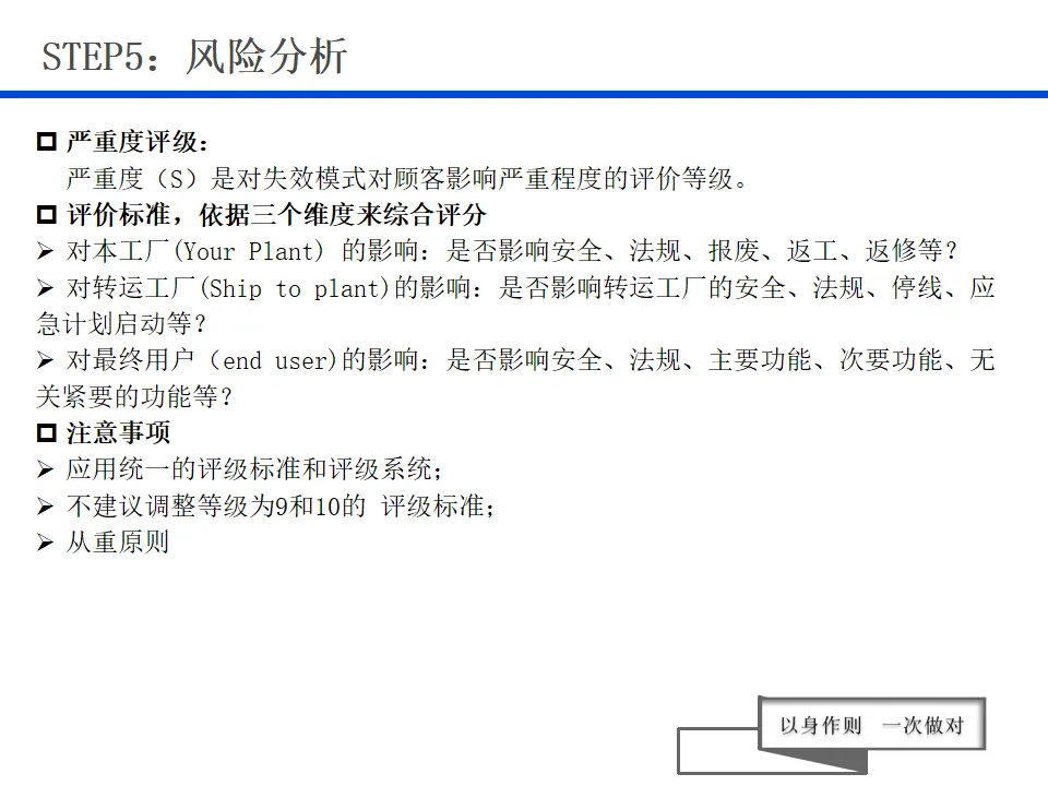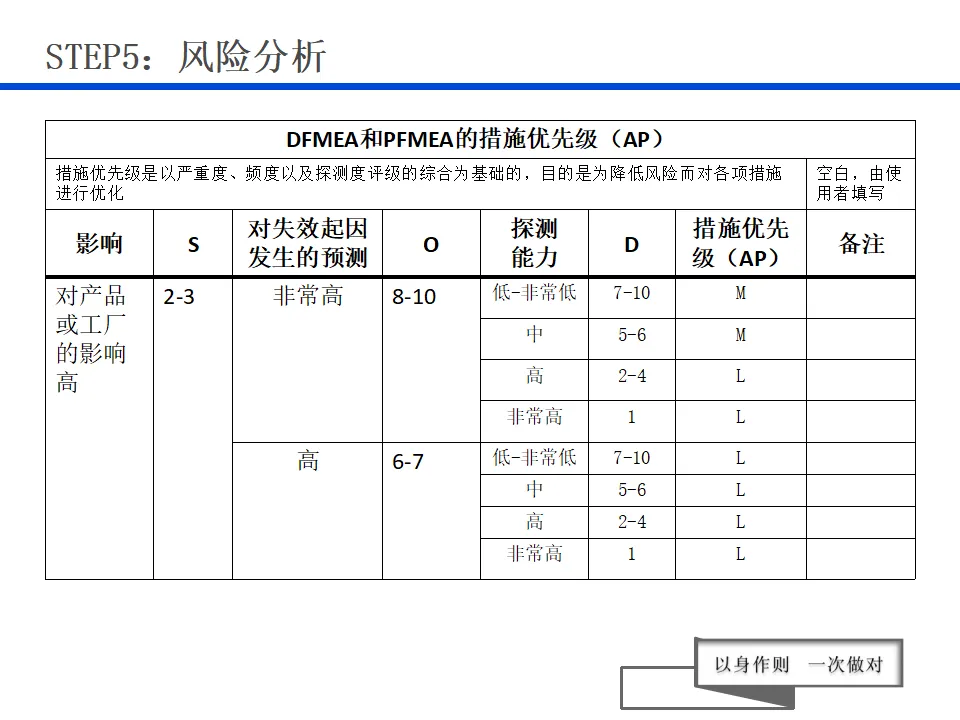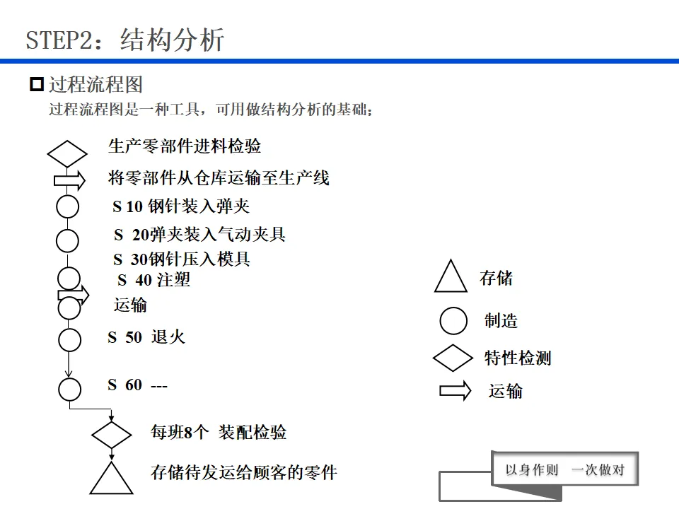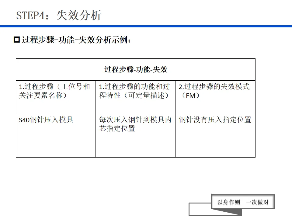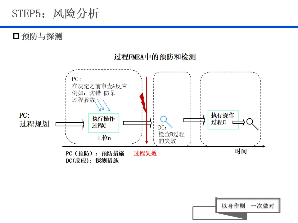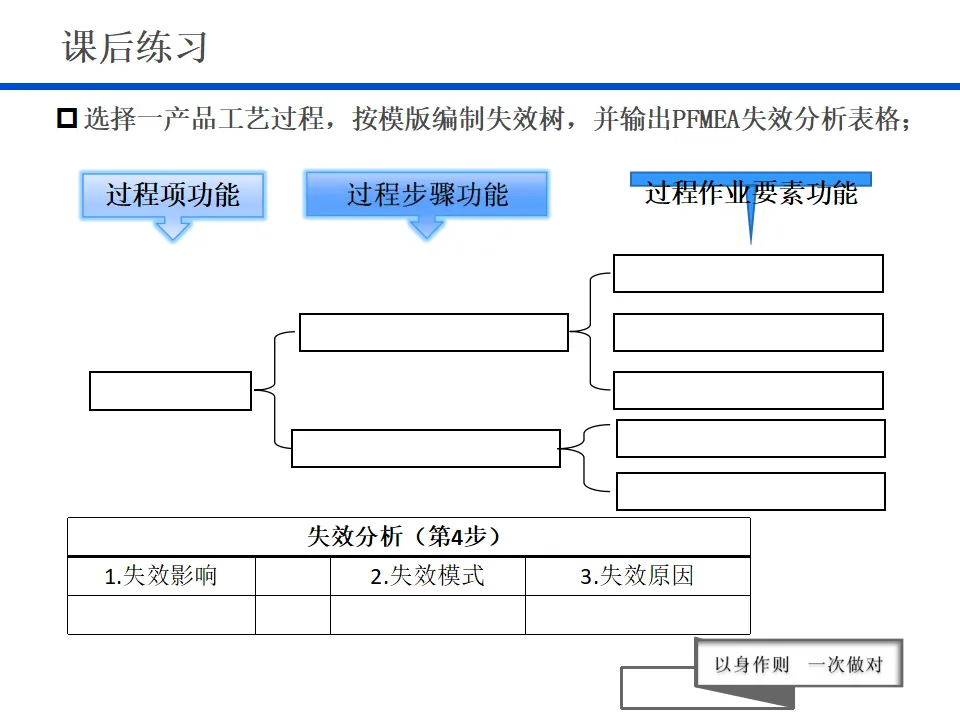 :根据过程步骤进行风险分析。PFMEA关注制造过程是否能够保证设计要求得以实现。它分析的对象是过程步骤、工位、作业要素。