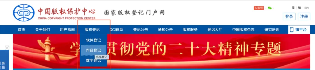 登录中国版权保护中心官网(https://www.ccopyright.com.cn/) → 点击版权登记,进入著作权登记系统: