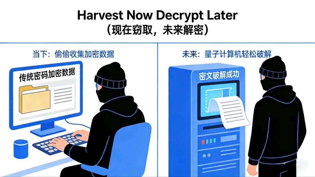 尤其是黑客常用的一种叫 “Harvest Now Decrypt Later(现在窃取,未来解密)” 的攻击。简单说,就是现在他们悄悄截获咱们用传统密码加密的企业核心数据、金融转账信息、政务敏感数据,先存着。等未来量子计算技术成熟了,再一次性破解这些密文。到那时,我们今天觉得很安全的加密,可能就跟没锁一样了。