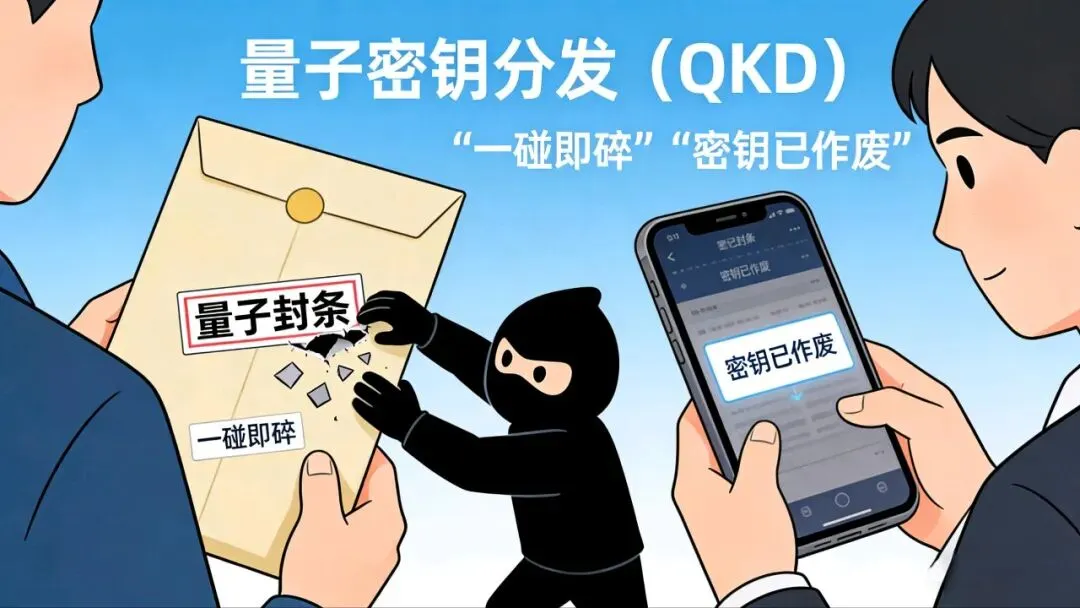 我们可以把量子密钥分发(QKD) 想象成**“寄一封贴有‘量子封条’的绝密信件”**。其中,量子态就是这封信独一份、一碰就碎的封条,密钥就是信里的核心内容。如果有人半路想偷拆信件窃取密钥,必然会破坏这个“量子封条”(也就是改变量子的偏振或相位状态)。收发双方能立刻察觉到这种异常,直接作废这组密钥重新分发。这样就从根源上杜绝了“被窃听却毫不知情”的情况。