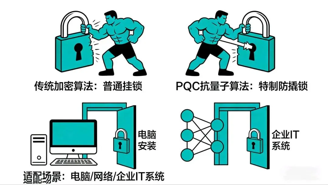 我们把加密算法比作家门上的锁。传统算法就是家里的普通挂锁,防防普通小偷没问题,但面对“量子计算”这个超级大力士,一推就开;而PQC,是专门为这种大力士设计的特制防撬锁,无论力气多大,都撬不开。更关键的是,这把“新锁”特别适配现有环境。它能直接装在咱们现在用的电脑、网络、企业IT系统这个“门框”上,不用推倒重来。相当于给现有所有安全系统,打了一层简单易操作的“抗量子补丁”。