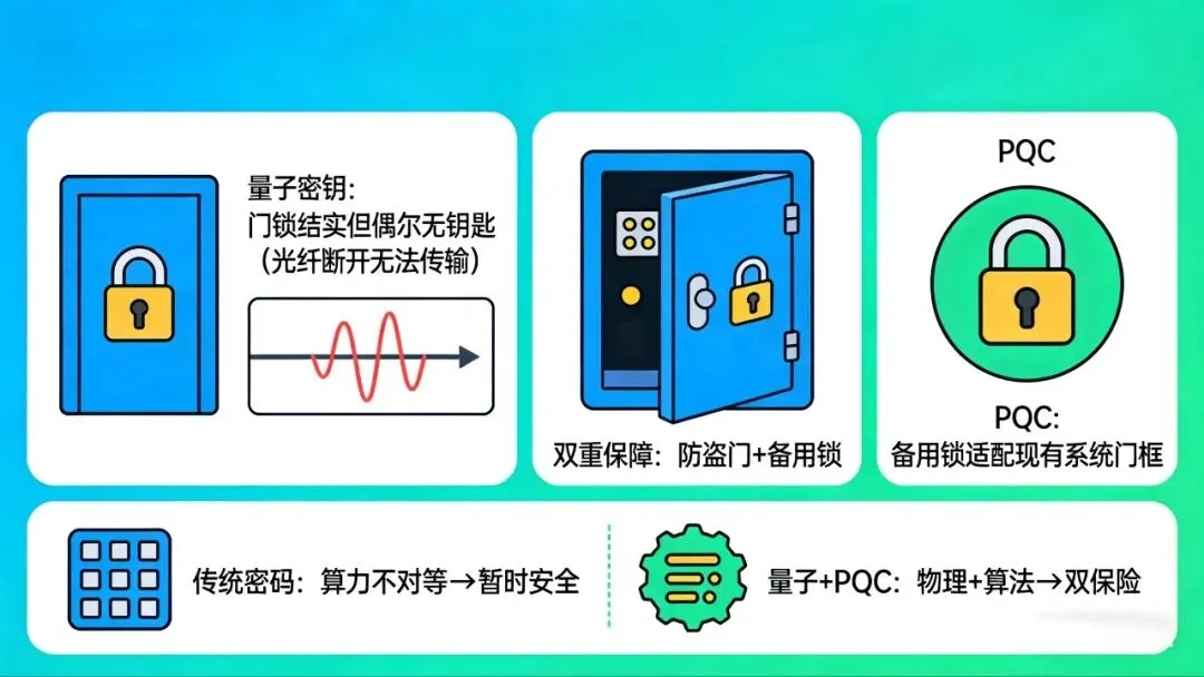✅ 兜底能力强:量子密钥得靠光纤、卫星,万一链路故障、信号波动,PQC能立刻顶上,保证业务不中断,做到安全无死角。