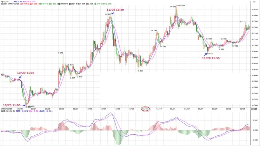 5、本节课后答疑中,对于MACD辅助判断背驰实例又讲了一遍,下面我们再次将其分析下: