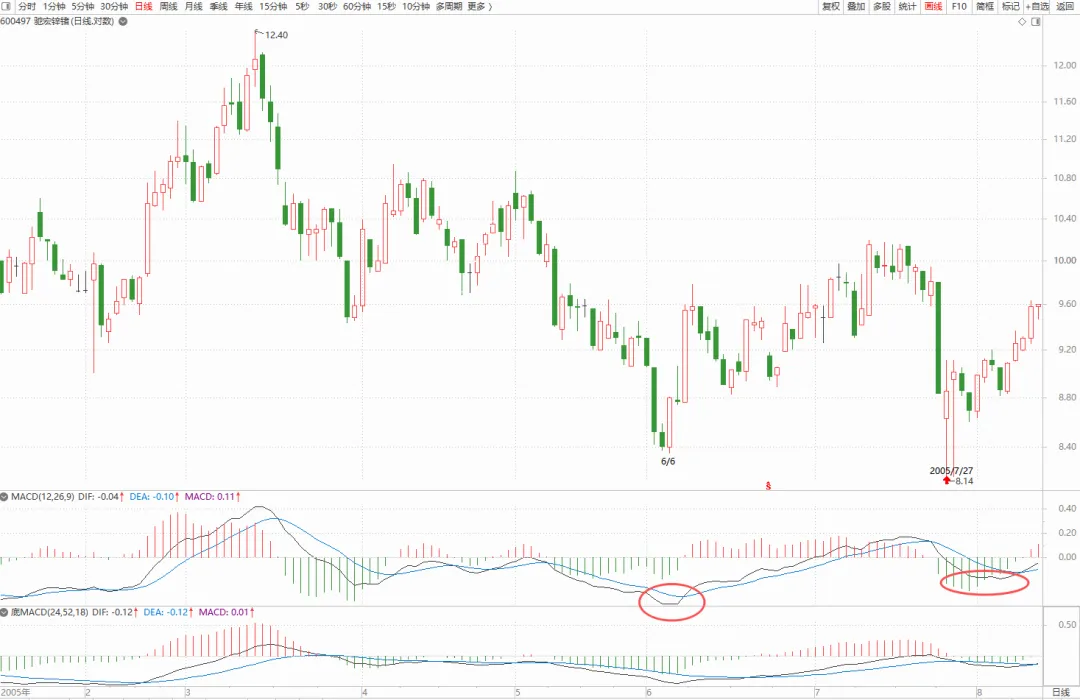 上图中的MACD我用了两种,上面的是正常的参数设置,下面这个是按照缠师的说明,放大一倍设置的,也就是缠师使用的参数,那么很明显,下面这个比较直观点。