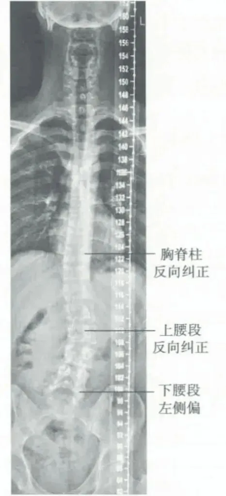腰胸段脊柱侧弯调节X线表现(此患者的冠状面调节未发展到颈段,表现出腰腿痛和腹胀、肋软骨痛)