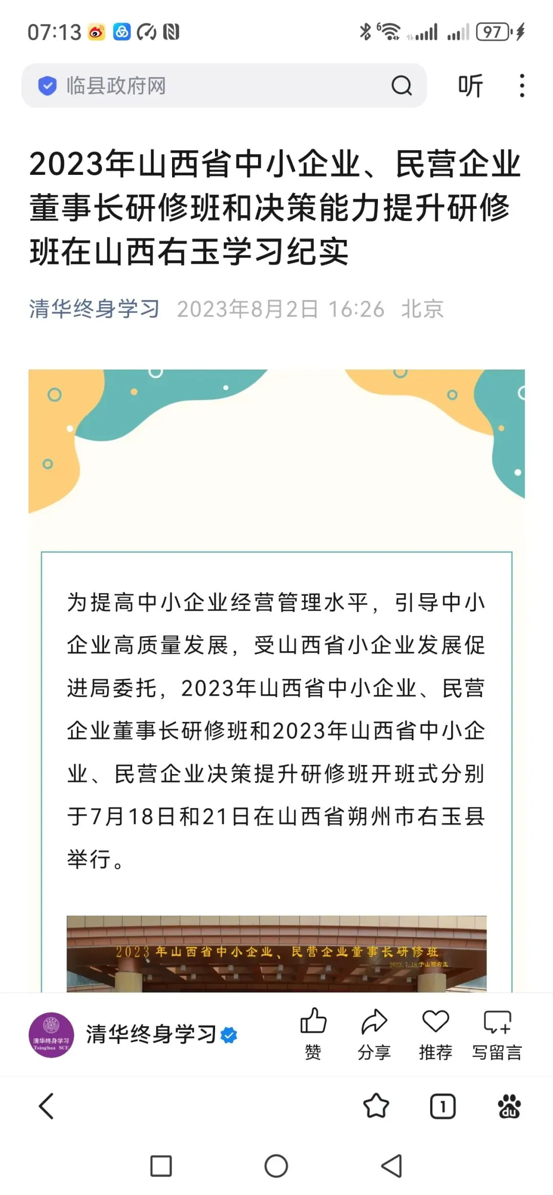 学习永无止境。在这个炎炎夏日,山西省中小企业发展促进局和清华大学继续教育学院在塞上绿洲——凉爽的右玉县,举办了2023年山西省中小企业、民营企业决策提升研修班。非常荣幸,也非常感谢山西省中小企业发展促进局和清华大学继续教育学院为我们提供的这次学习机会。我的学习目的主要是在提升自我能力的同时,为我们罗家山的振兴汲取经验。