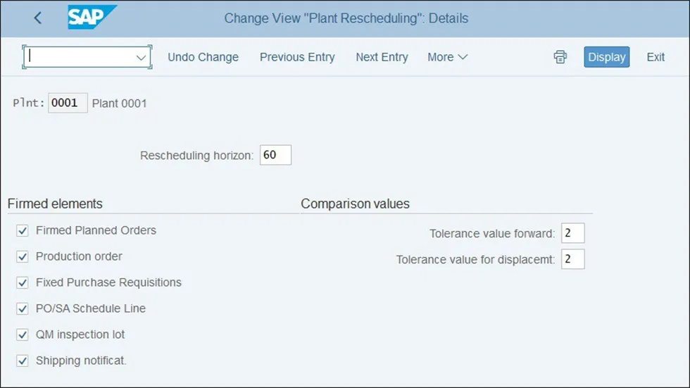 重新计划检查发生在 MRP 运行期间或 MRP 结果评估期间。在此过程中,MRP 将在未来检查可能涵盖需求的固定 MRP 要素。如果 MRP 在重新计划检查中找到固定的 MRP 要素,则它将生成一条异常消息,建议 MRP 控制器重新计划物料需求计划要素,而不是生成新的补货建议。