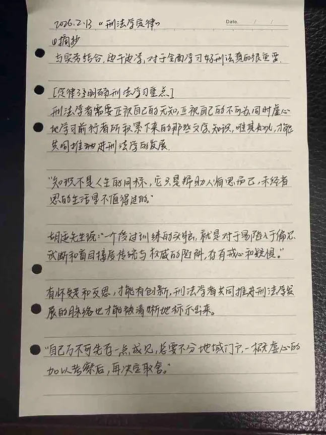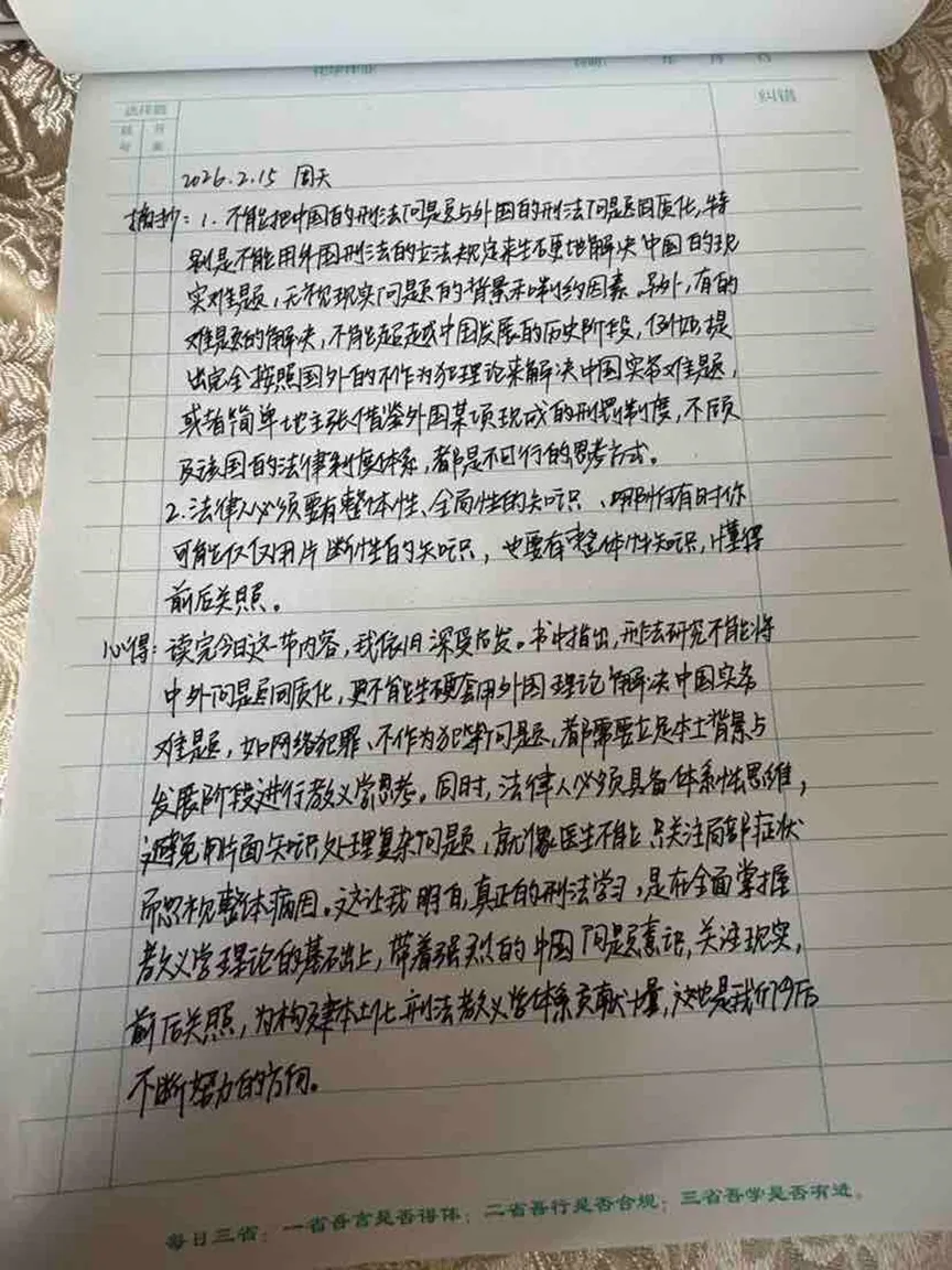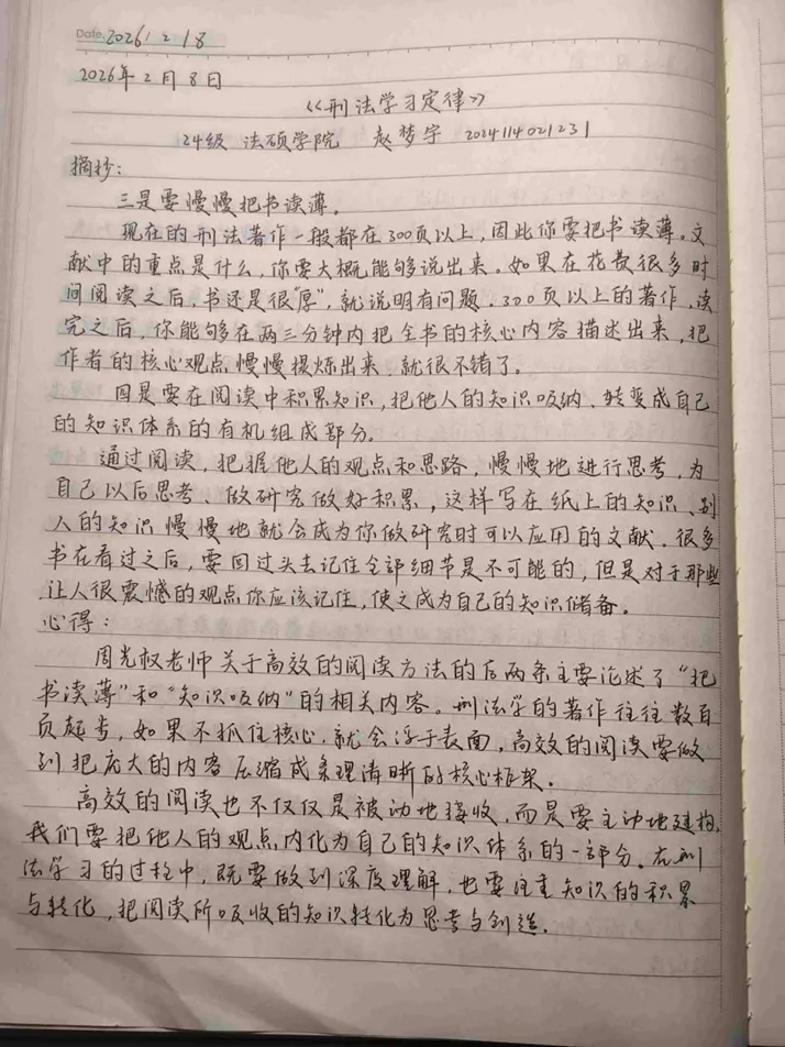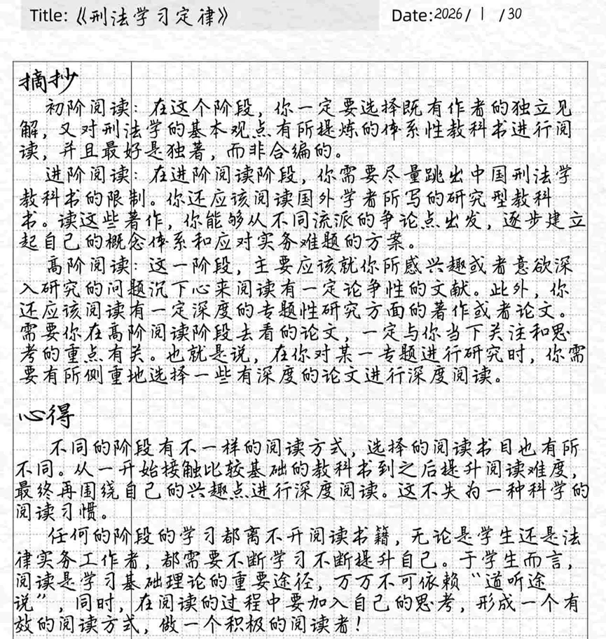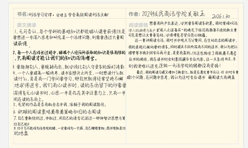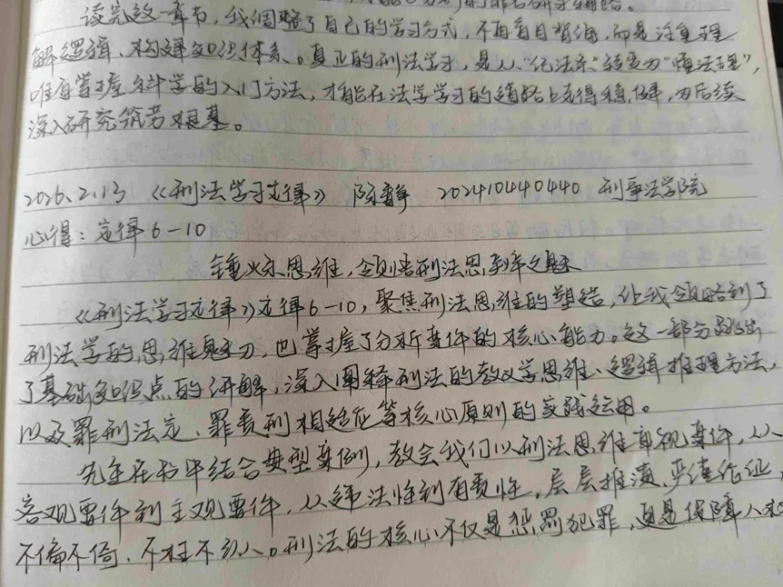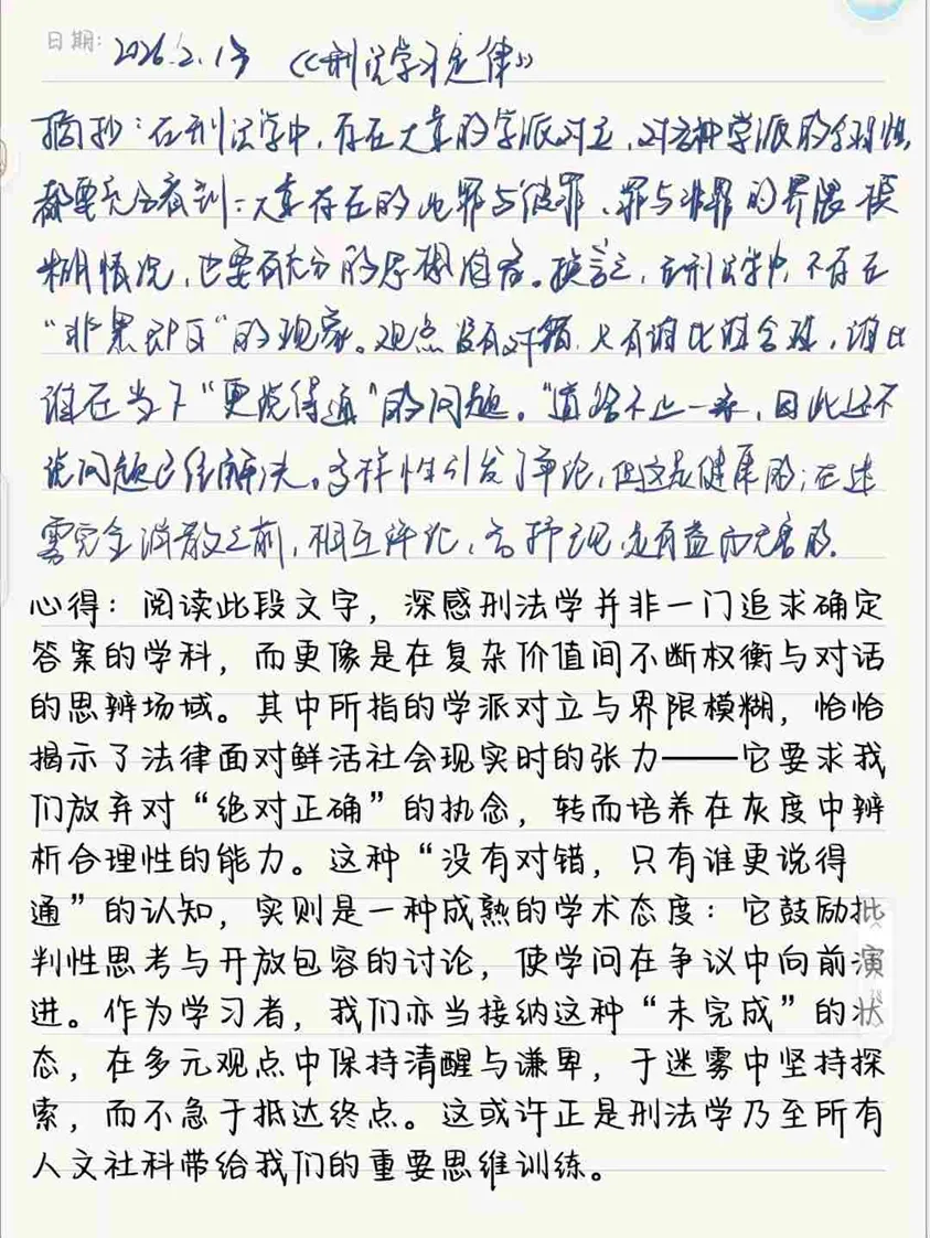 二十一天,足以让一种思考沉淀为习惯,也足以让一本书从指尖流入心底。《刑法学习定律》不是一部艰深的法典释义,亦非一本轻松的枕边读物——它关乎方法,关乎路径,关乎如何在严谨的学科中建立属于自己的认知秩序。同学们留下的笔记,便是这场跋涉中最诚实的见证。有人在概念的迷宫中画出地图,有人在逻辑的缝隙里写下追问,有人在空白处与作者轻声辩驳。以下,便是这些思考的痕迹。