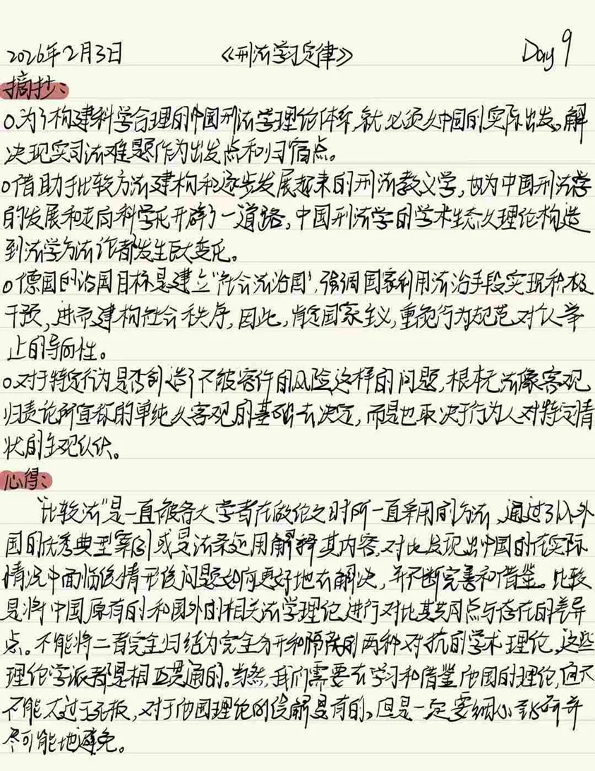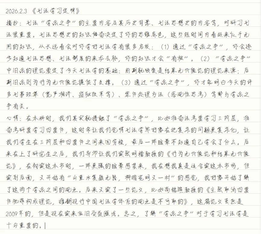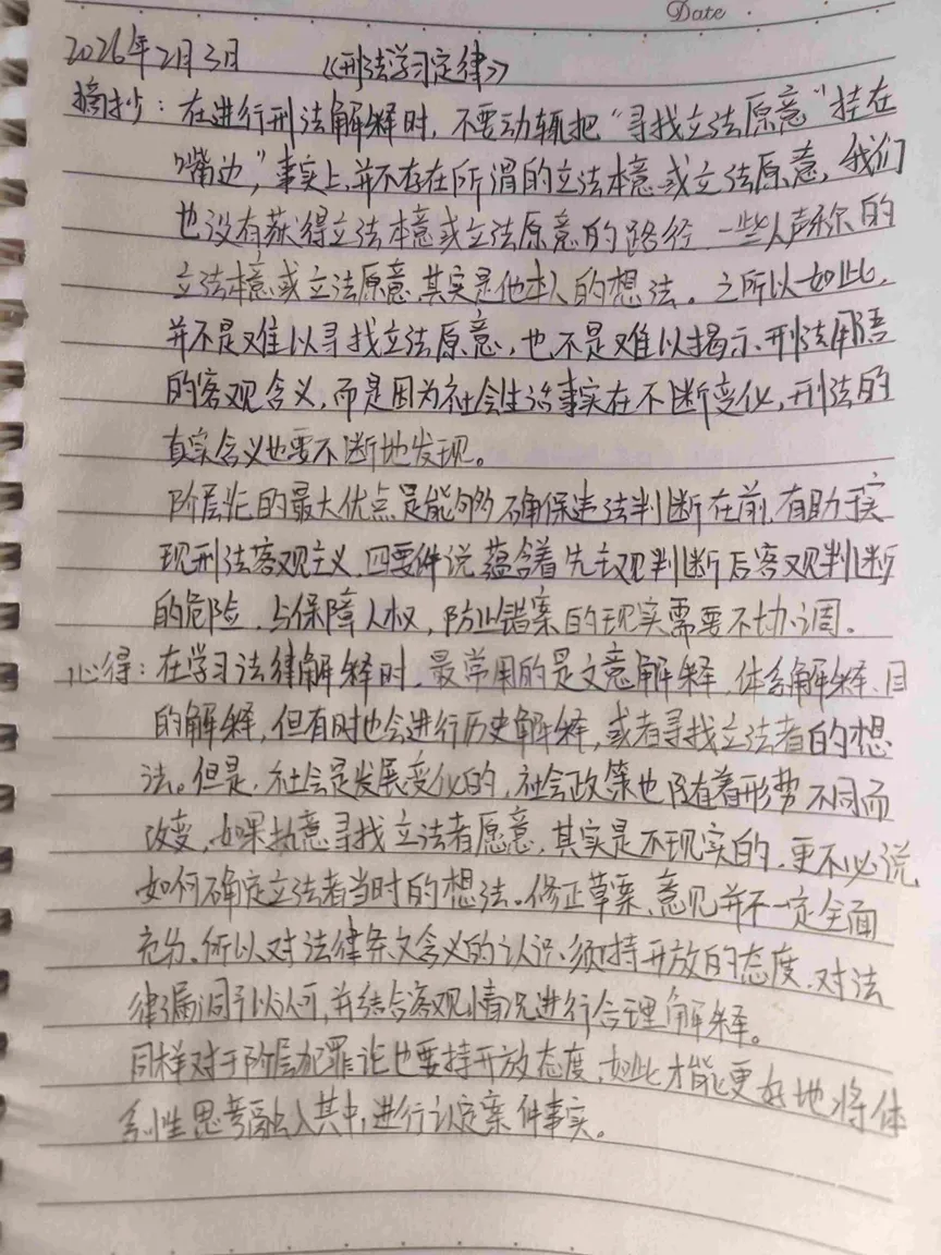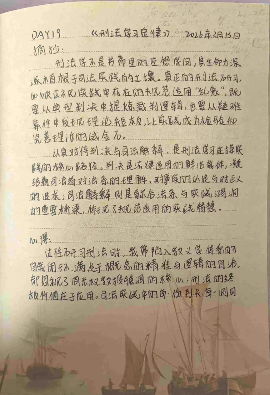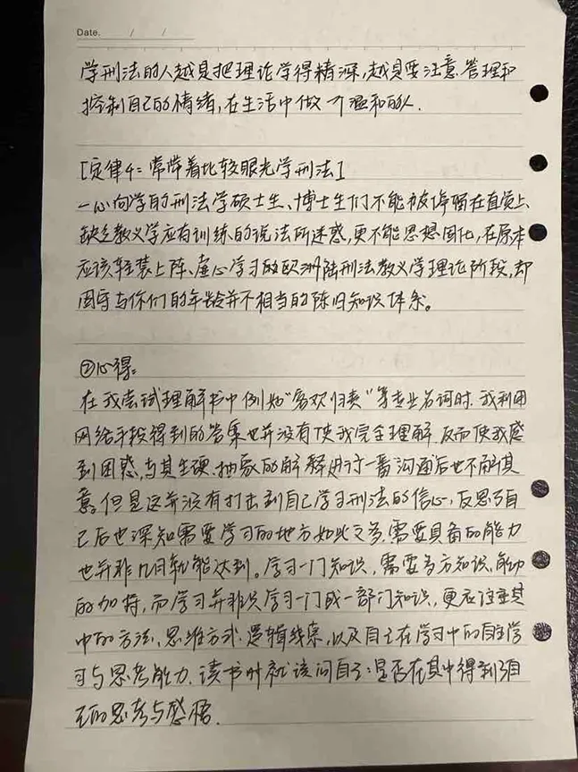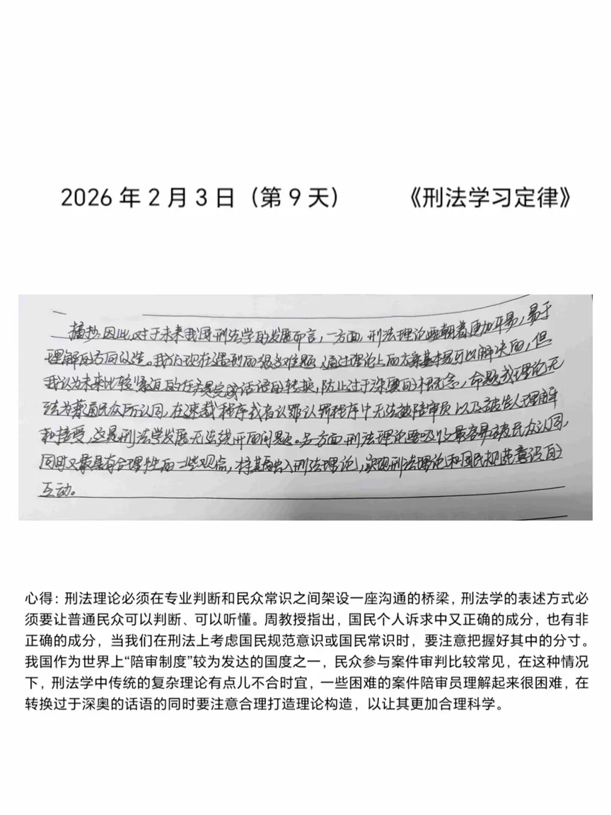 二十一天,足以让一种思考沉淀为习惯,也足以让一本书从指尖流入心底。《刑法学习定律》不是一部艰深的法典释义,亦非一本轻松的枕边读物——它关乎方法,关乎路径,关乎如何在严谨的学科中建立属于自己的认知秩序。同学们留下的笔记,便是这场跋涉中最诚实的见证。有人在概念的迷宫中画出地图,有人在逻辑的缝隙里写下追问,有人在空白处与作者轻声辩驳。以下,便是这些思考的痕迹。