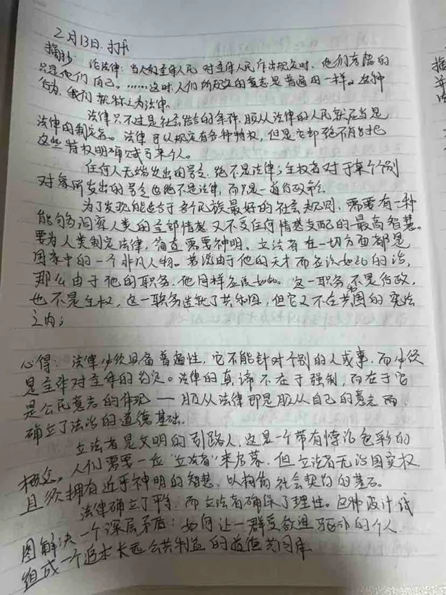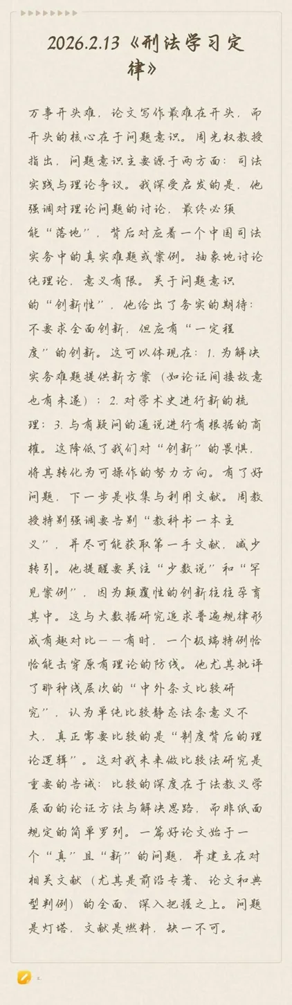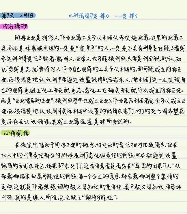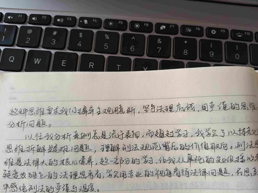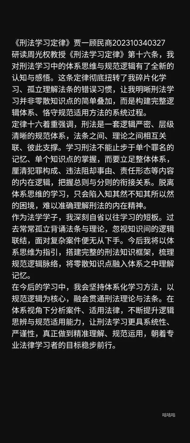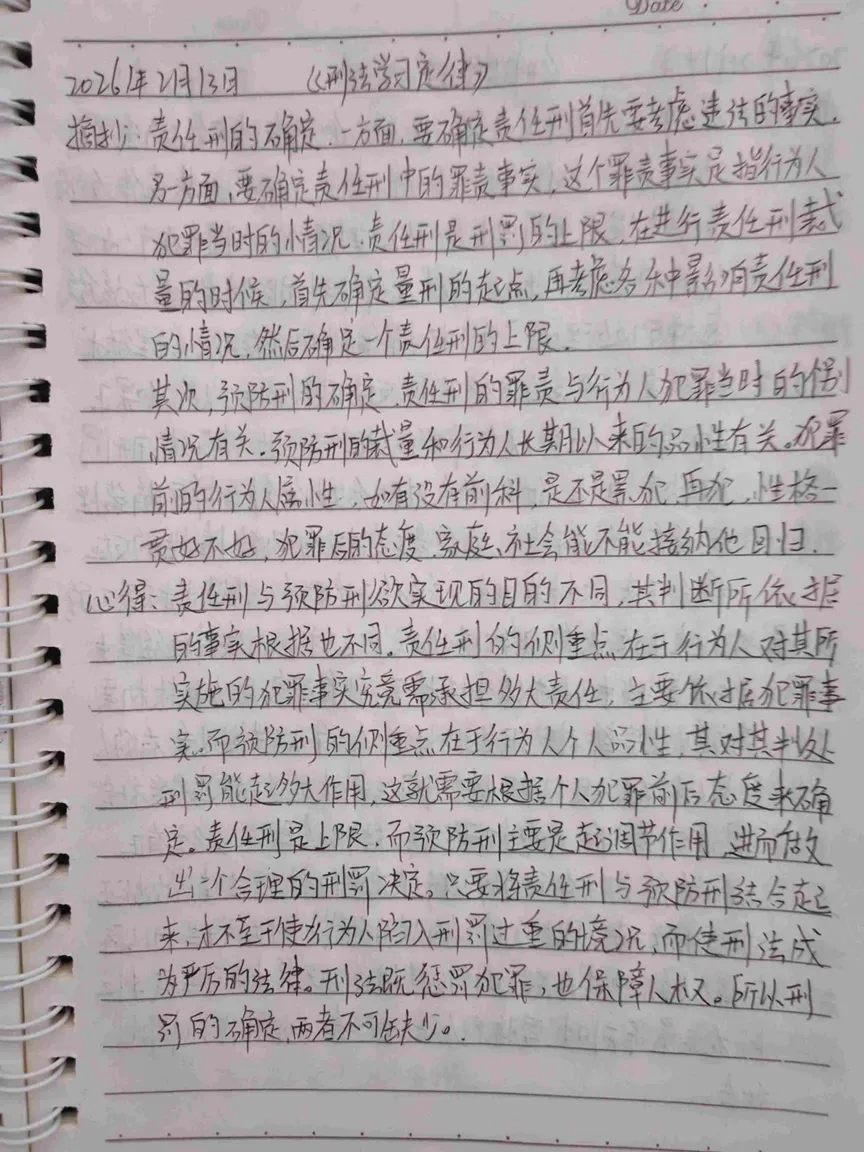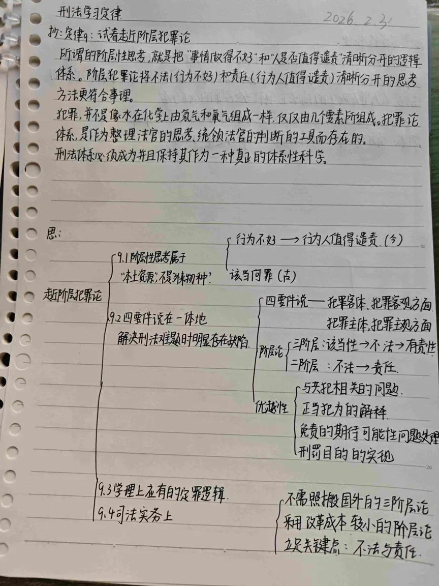 二十一天,足以让一种思考沉淀为习惯,也足以让一本书从指尖流入心底。《刑法学习定律》不是一部艰深的法典释义,亦非一本轻松的枕边读物——它关乎方法,关乎路径,关乎如何在严谨的学科中建立属于自己的认知秩序。同学们留下的笔记,便是这场跋涉中最诚实的见证。有人在概念的迷宫中画出地图,有人在逻辑的缝隙里写下追问,有人在空白处与作者轻声辩驳。以下,便是这些思考的痕迹。