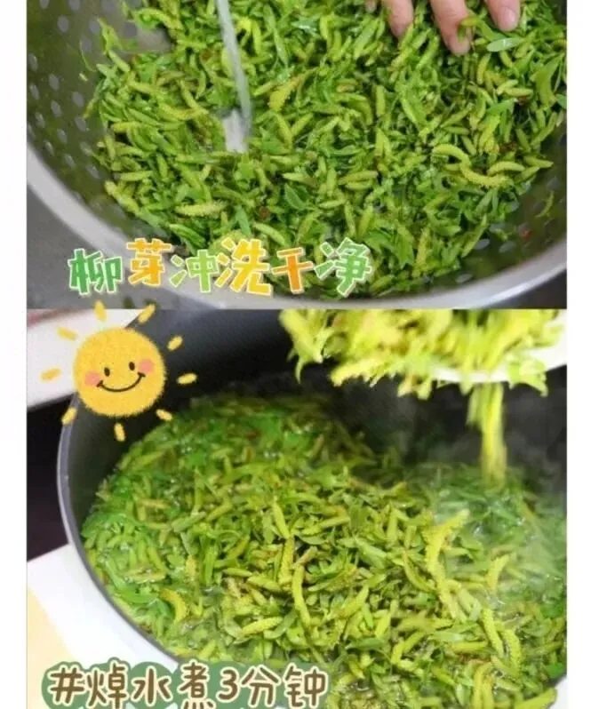 ①凉拌柳芽:把处理好的柳芽加盐、醋、生抽、蒜末、香油一起拌,清爽解腻。