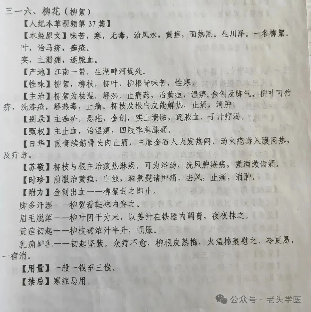 ①柳絮→即柳花,能祛湿止痛,治黄疸,湿痹。
