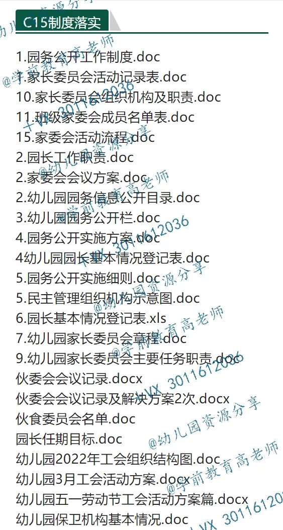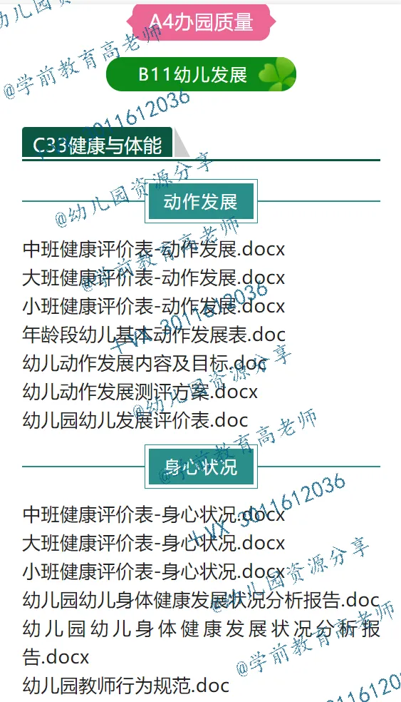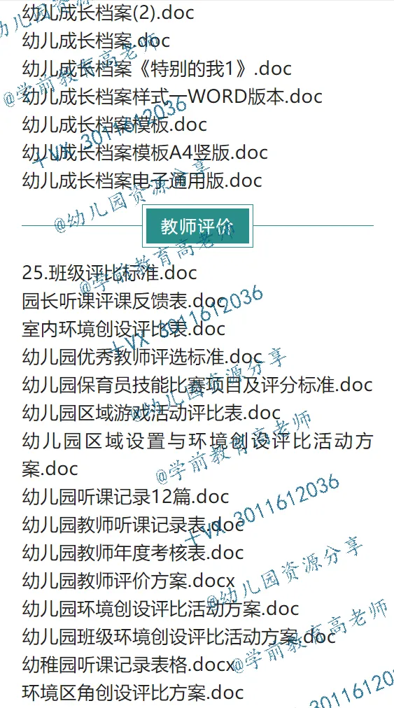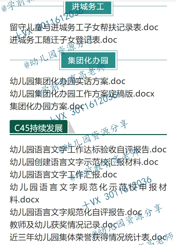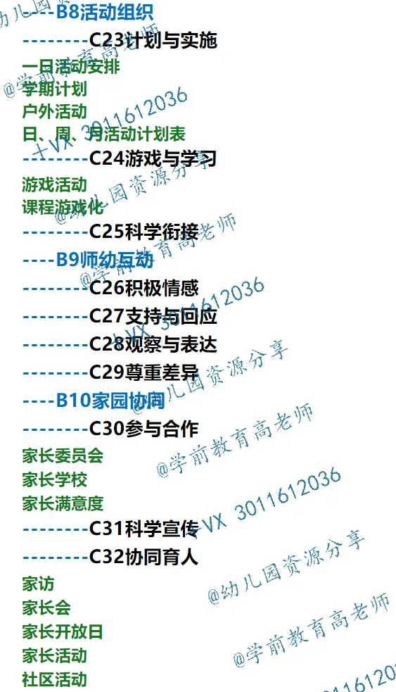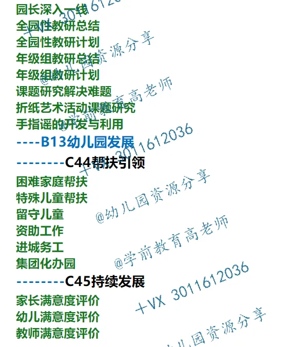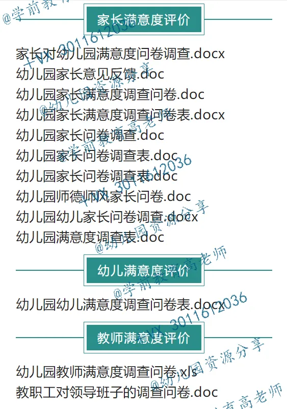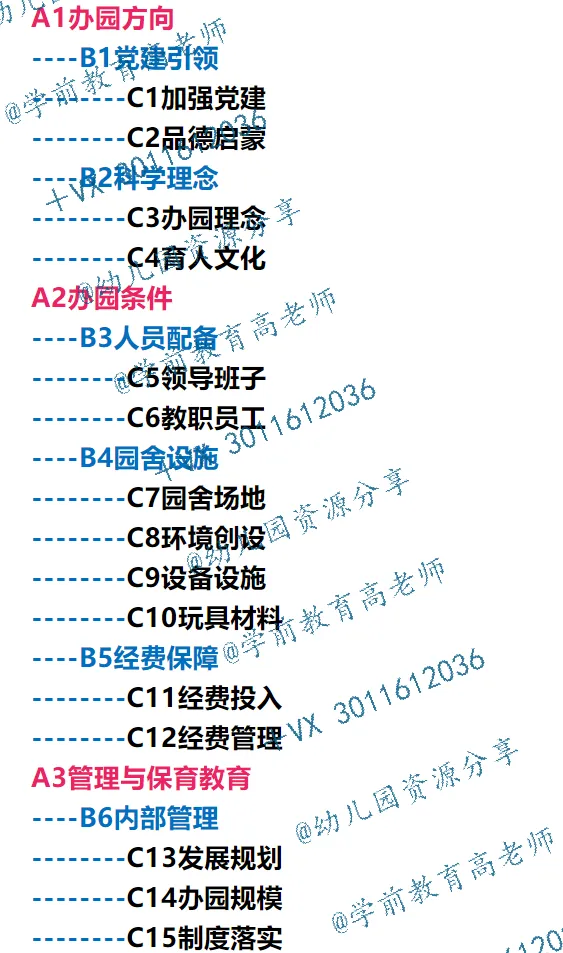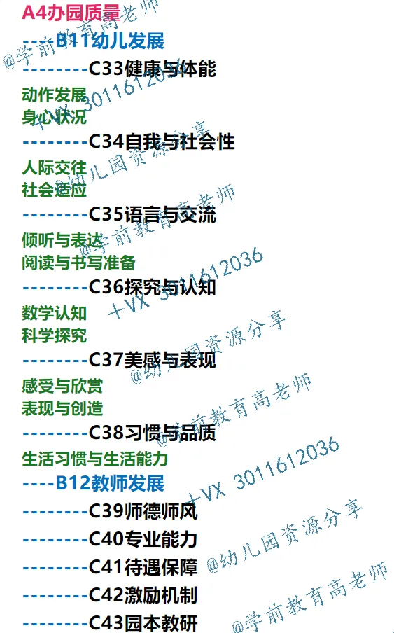 本套资料根据《幼儿园办园质量综合评价指标体系》全新整理,和细则百分百完美对应,对于幼儿园的办园质量综合评价创建工作有很好指导作用。4大版块,45个观测点,127个文件夹,1373个文档,非常细致。@+VX 3011612036 希望各幼儿园在办园质量综合评价创建工作方面一切顺利!