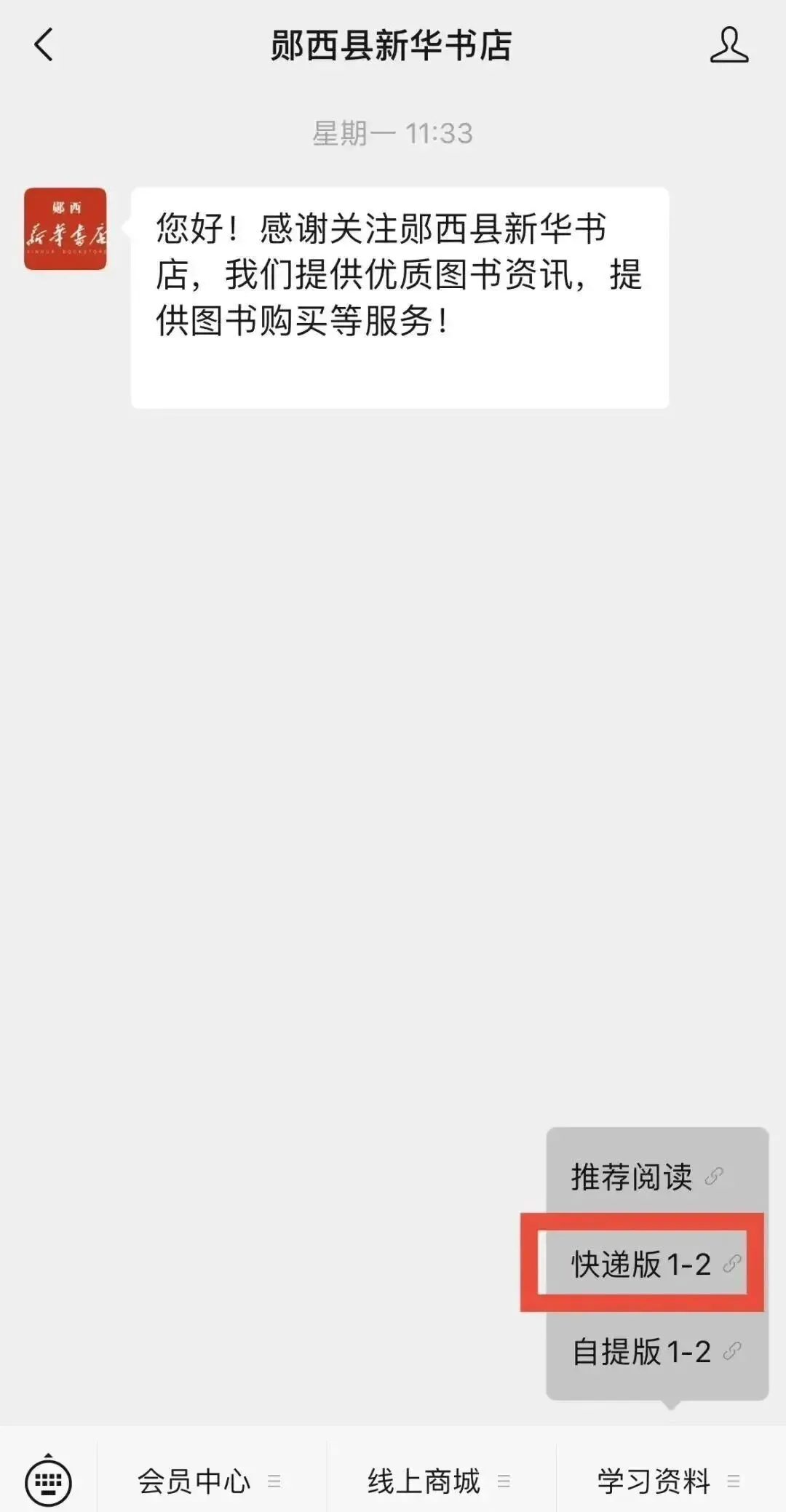 第一步:请各位家长微信扫描二维码关注“郧西县新华书店”公众号。