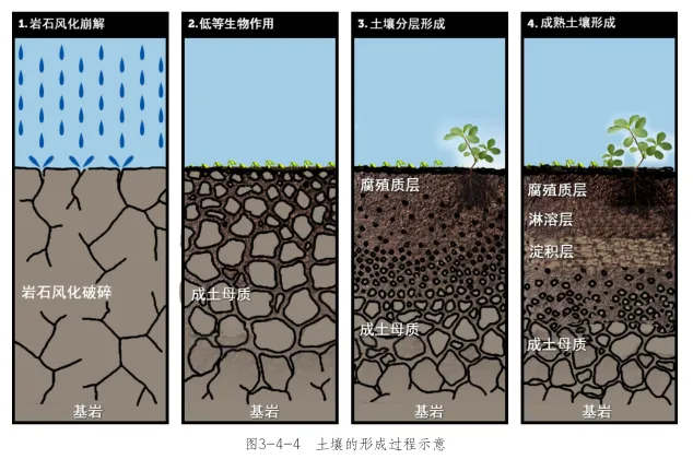 暴露在地表的风化壳是土壤形成的物质基础,通过与周围环境发生一系列复杂的物理、化学和生物反应,逐渐形成具有肥力特征的土壤。