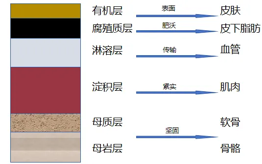 成土母质在气候、生物、地形、时间等五大成土因素长期综合作用下,通过物质迁移与转化形成土壤分层结构(土壤剖面)。