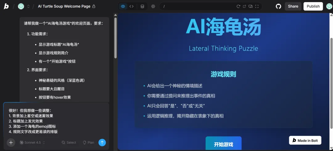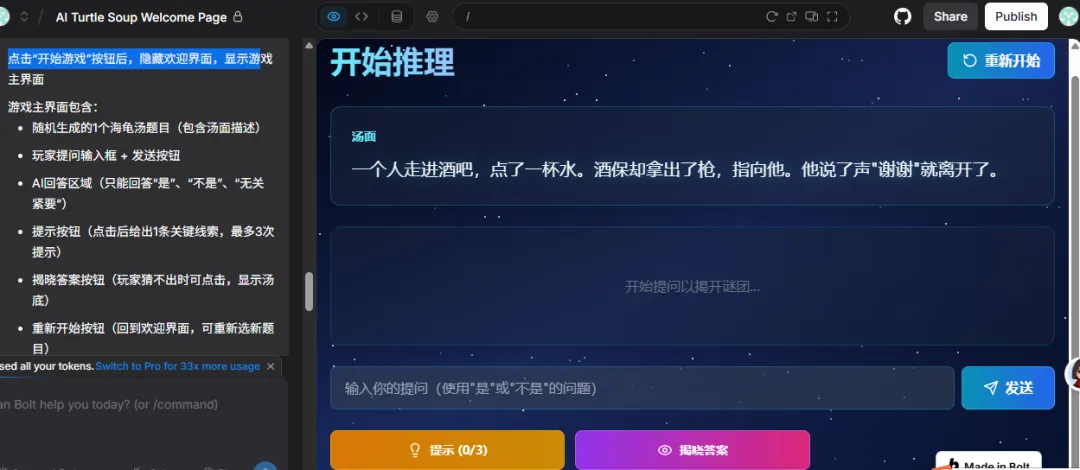 输入上面的提示词后,点击“开始游戏”,进入游戏界面可以开始推理了。