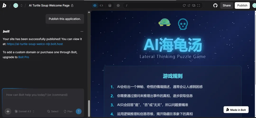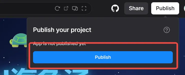 最后点击页面右上角的 "Publish" 按钮,稍等片刻完成部署,就能获得一个可直接访问的线上网站啦!