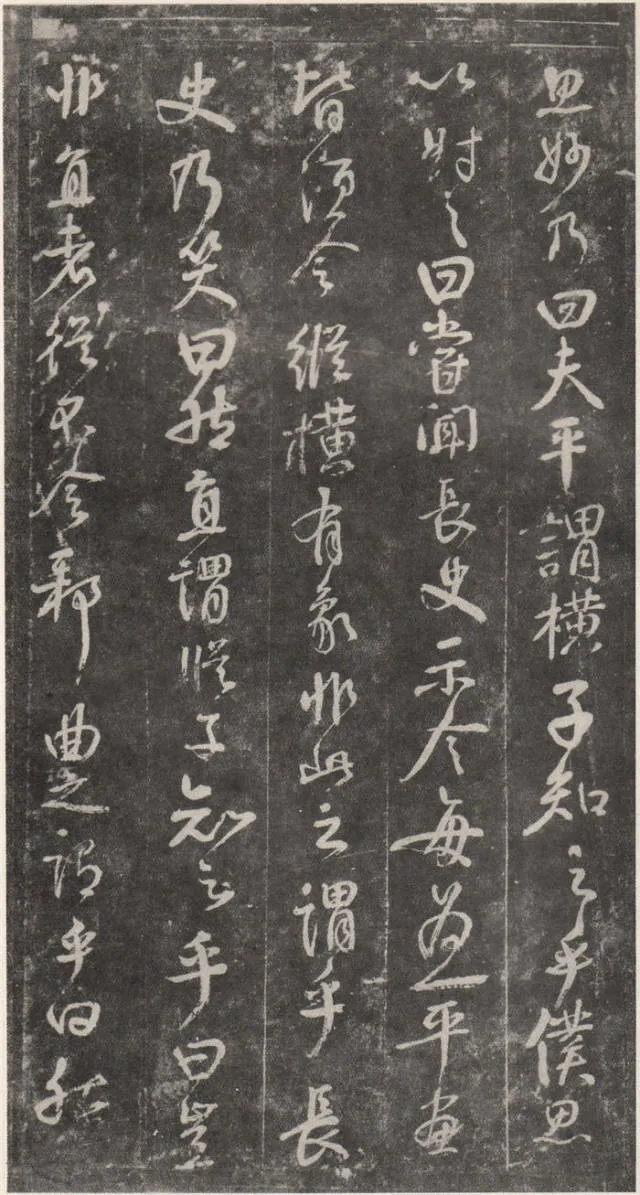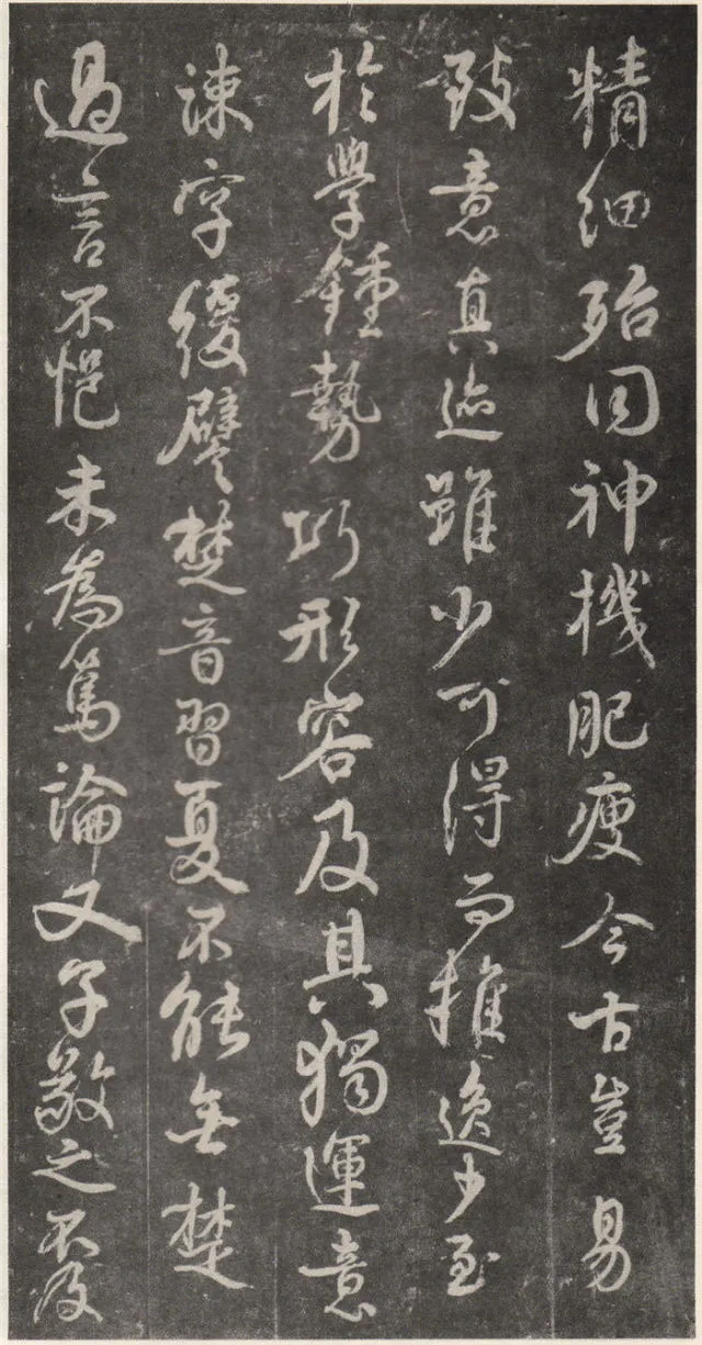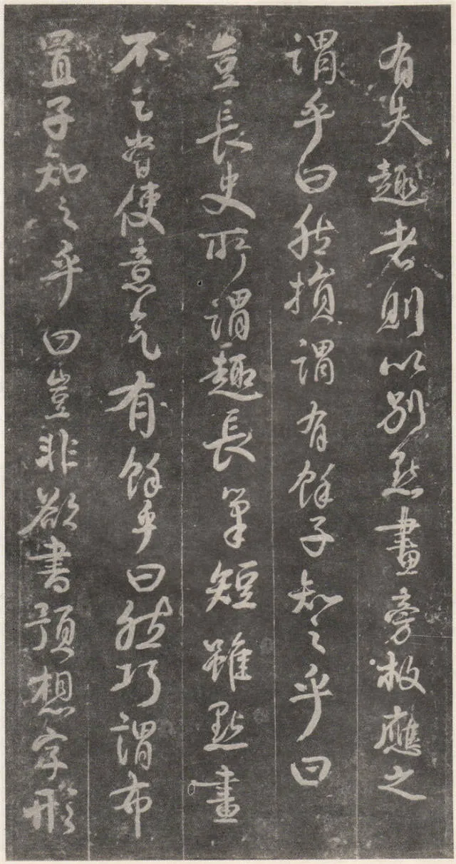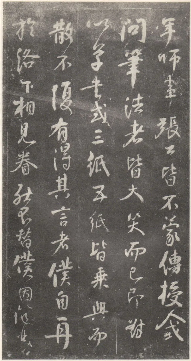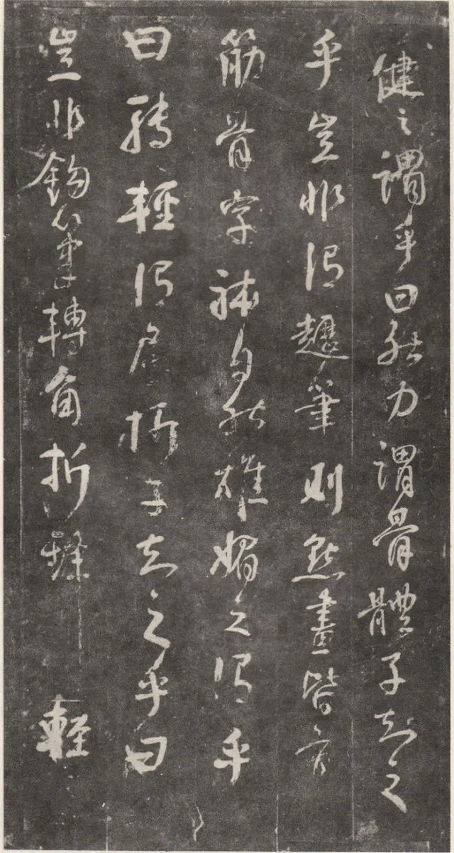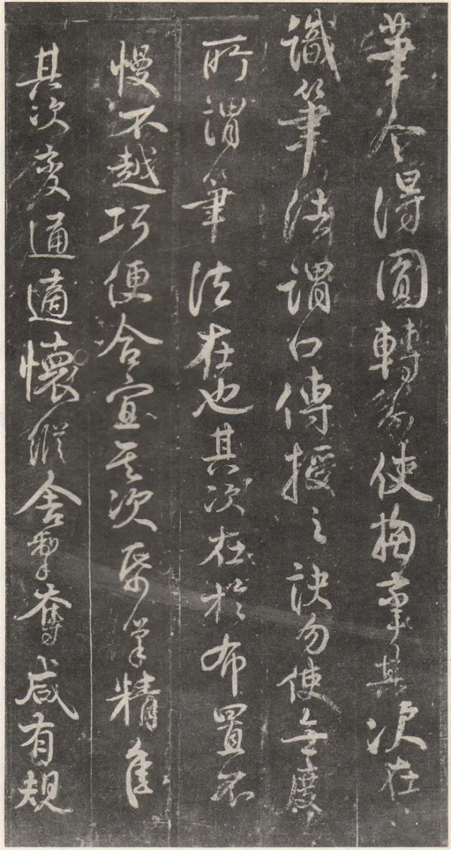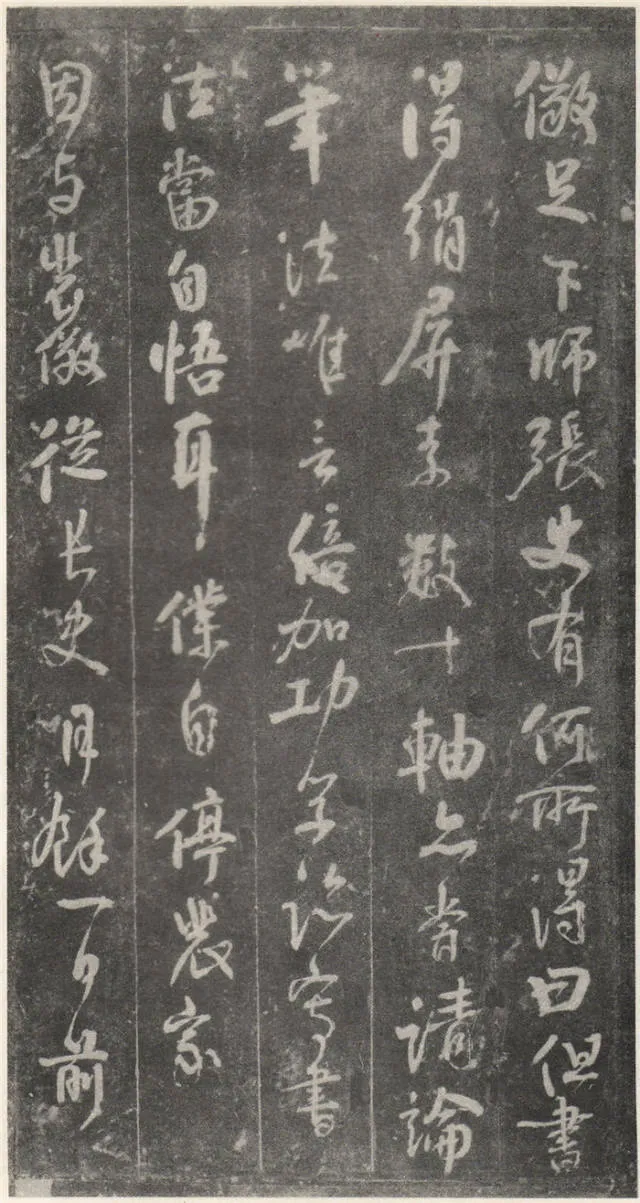 原文 余罢秩醴泉,特诣京洛,访金吾长史张公,请师笔法。长史于时在裴儆[jǐng]宅憩止,有群众师张公求笔法,或存得者,皆曰神妙。仆顷在长安二年师事张公,皆不蒙传授,人或问笔法者,皆大笑而已,即对以草书,或三纸、五纸,皆乘兴而散,不复有得其言者。仆自再于洛下相见,眷然不替。仆因问裴儆:“足下师张史有何所得?”,曰:“但书得绢、屏、素数十轴,亦偿请论笔法,惟言倍加功学临写,书法当自悟耳”。解读:这一段,颜真卿叙述了得到张旭笔法的不易:一是颜真卿两次求师笔法。即“余罢秩醴泉”和“仆顷在长安二年师事张公”这两次。二是“人或问笔法者,皆大笑而已”,包括裴儆在内,张旭只给作品,不作正面回答,更可以看出笔法的珍贵。本节有两个字需加以注意:一是“仆顷在长安二年师事张公”的“顷”字,“顷”为顷刻之意,引申为不久以前。颜真卿在长安用二年的时间“师事张公”,结合颜真卿的年谱可以大略得知此次拜师是指颜真卿在天宝二年的罢官期间。二是在原文中“或存得者”,有将“存”字写为“有”的,对比“或存得者”与“或有得者”之意,前者有仅得到只言片语之意,后者则是似乎已经得到了张旭的论书的全部。当时李白、李阳冰、贺知章都不同程度的受到了张旭的影响,颜真卿和崔邈是写在史书上张旭的嫡传弟子,又“存”字为拓片所固有,故认为“存”字比较符合此节的文意,也符合情理。原文 仆自停裴家,因与裴儆从长史月余。一夕前请,曰:“既承兄丈奖谕,日月滋深,夙夜工勤,溺于翰墨,倘得闻笔法要诀,则终为师学,以冀至于能妙,岂任感戴之诚也!”。长史良久不言,乃左右眄[miǎn]视,拂然而起。仆乃从行来至竹林院小堂,张公乃当堂踞床而坐,命仆居于小榻而曰:“笔法玄微,难妄传授。非志士高人,讵可与言要妙也。书之求能,且攻真草,今以授之,可须思妙”。解读:此节叙述了颜真卿通过真诚的表白,终于打动了张旭。有两点需加注意:一是“既承兄丈奖谕”的“兄丈”二字,“兄”字古有师长之意,故在古代非师徒关系的一方称对方为兄时,对方一般不称对方为弟;“丈“字有尊敬的长者之意。因此“兄丈”二字,可理解为前辈、老人家。由此可以推断此刻的颜真卿还不是张旭的徒弟,否则颜真卿可直接称呼张旭为“恩师”、“尊师”或“吾师”。二是张旭指出草书和真书双修的学书主张,在《唐人书评》所列的十二位唐朝草书大家中,有着“唐朝第一妙腕”之称的孙过庭(排名第二,位列张旭之后)在《书谱》中说:“草不兼真,殆于专谨;真不通草,殊非翰札”,真草一起学习的观点在这里得到了草圣张旭的再一次明确印证。原文 乃曰“夫平谓横,子知之乎?”,仆思以对之曰:“尝闻长史示令每为一平画,皆须令纵横有象,非此之谓乎?”,长史乃笑曰:“然”。解读:汉字中,横竖笔画最多。在张旭与颜真卿探讨这个问题前已多有论述。主要就是横划的书写要有起伏,不得拖笔,线条要有弹性,就像骑手的马缰绳——徐放徐收;一幅作品中以看不到横划的突兀排列为美,忌“堆柴”之弊。原文 “直谓纵,子知之乎?”,曰:“岂非直者从,不令邪曲之谓乎?”,曰:“然”。解读:竖划必须“从”于横划,注意横竖之间的呼应。在保证竖划相对较直的同时,一字之中的两竖不得等同“立柱”,否则极易生硬、僵死,状如算子;一字之中的竖划主笔要尽量不与作品的总体横势相垂直,否则容易失去上下的连贯,出现“直则无力”的弊病。同时竖划不宜过长,因为把握不好就会造成“割纸”的错觉。原文 “均谓间,子知乎?”,曰:“常蒙示以间不容光之谓乎?”解读:方面在笔墨散开时要取法自然,和谐统一,收拢后要计白当黑,不争不犯。另一方面要处理好直与非直,密与非密等辩证关系,力争在矛盾双方由此及彼的桥梁上行走。原文 曰:“密谓际,子知之乎?…岂不为筑锋下笔皆令宛成,不令其疏之意乎?” 解读:相关联的下一笔要果敢有力,承接处就像盖房子中柱子与檩柁之间的咬合。“筑”,捣也,意为由上而下的击打;“宛”,凹进去的意思。原文 曰:“锋谓末,子知之乎?”,曰:“岂非末已成画,复使锋健之谓乎?”,曰:“然”。解读:一方面末笔出锋要意完神足,如“也”字楷书末笔要缓起轻收,形成的钝势小勾就像刚刚把弓拉满,箭头被一点点的缩到了弓背的挽手处的样子;另一方面,在书写过程中要注意笔锋的调整,切不可因为是末笔就草率为之,造成笔锋的“散包”和线条的“泄气”。原文 “力谓骨体,子知之乎?”,“岂非谓趯[tì]笔,则点画皆有筋骨,字体自然雄媚之谓乎?”。解读:“趯”,意为跳跃,在永字八法中指“钩”。书法中所谓的“力”,是指各种线条按着不同字形组合起来后,所表现出来的一种张力和视觉上的冲击,这种力不是蛮力,是以具象对抽象的审美表述。张旭对颜真卿的回答没有表态,说明颜真卿的回答尚不够准确。原文 曰:“转轻谓展折,子知之乎?”,曰:“岂非钩笔转角,折锋轻过,亦谓转角为暗过之谓乎?”,曰:“然”。解读:在书写“横折拐角处”时,由左而右,在拐点处稍右再回锋于拐点,调锋而下;在书写“钩”时,锋至出锋处依然暗过之,而后蹲锋回返向上左出。“展”,转也。原文 “次谓牵掣,子知乎?”,曰:“岂非谓为牵为制,次意挫锋,使不怯滞,令险峻而成之谓乎?”,曰:“然”。解读:两个笔划的连接处,常常会出现游丝,这种游丝起到了局部与整体