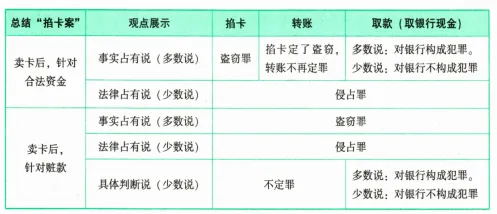 (1)多数说(事实占有说):掐卡行为构成盗窃罪。转账行为不再定罪。取款行为对银行构成诈骗罪或盗窃罪。