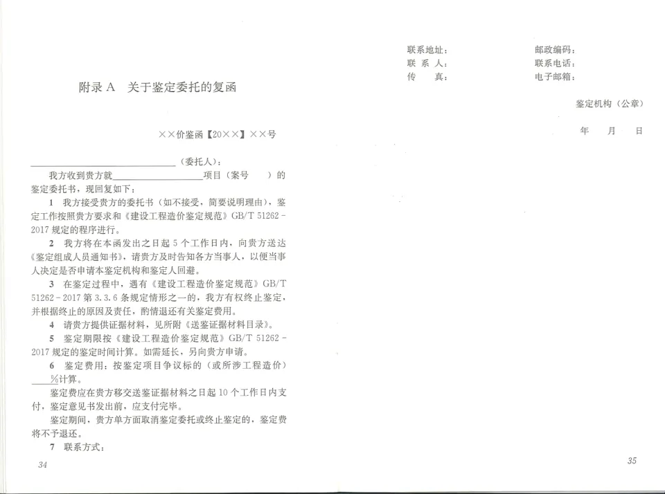 ________________________________________________(委托人): 我方收到贵方就____________________________________项目(案号)的鉴定委托书,现回复如下: 1 我方接受贵方的委托书(如不接受,简要说明理由),鉴定工作按照贵方要求和《建设工程造价鉴定规范》 GB/T 51262-2017规定的程序进行。 2 我方将在本函发出之日起5个工作日内,向贵方送达《鉴定组成人员通知书》,请贵方及时告知各方当事人,以便当事人决定是否申请本鉴定机构和鉴定人回避。 3 在鉴定过程中,遇有《建设工程造价鉴定规范》 GB/T 51262-2017第3.3.6条规定情形之一的,我方有权终止鉴定,并根据终止的原因及责任,酌情退还有关鉴定费用。 4 请贵方提供证据材料,见所附《送鉴证据材料目录》。 5 鉴定期限按《建设工程造价鉴定规范》 GB/T 51262-2017规定的鉴定时间计算。如需延长,另向贵方申请。 6 鉴定费用:按鉴定项目争议标的(或所涉工程造价)%计算。 鉴定费应在贵方移交送鉴证据材料之日起10个工作日内支付,鉴定意见书发出前,应支付完毕。 鉴定期间,贵方单方面取消鉴定委托或终止鉴定的,鉴定费将不予退还。 7 联系方式:联系地址:邮政编码: 联 系 人:联系电话: 传真:电子邮箱: