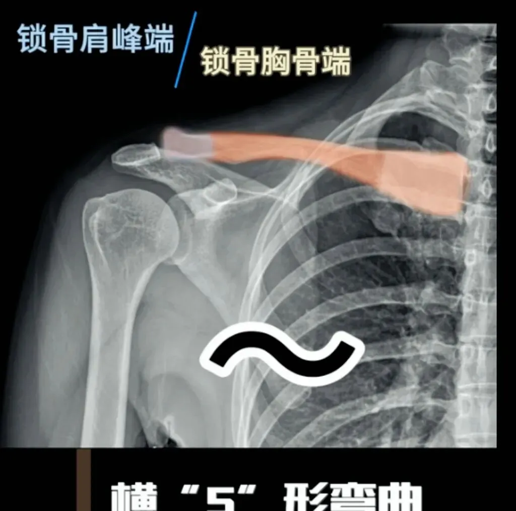锁骨呈横S型弯曲,内侧端粗大,有关节面,与胸骨柄相关节,称胸骨端。外侧端扁平,有小关节面,与肩胛骨肩峰相关节,称肩峰端。