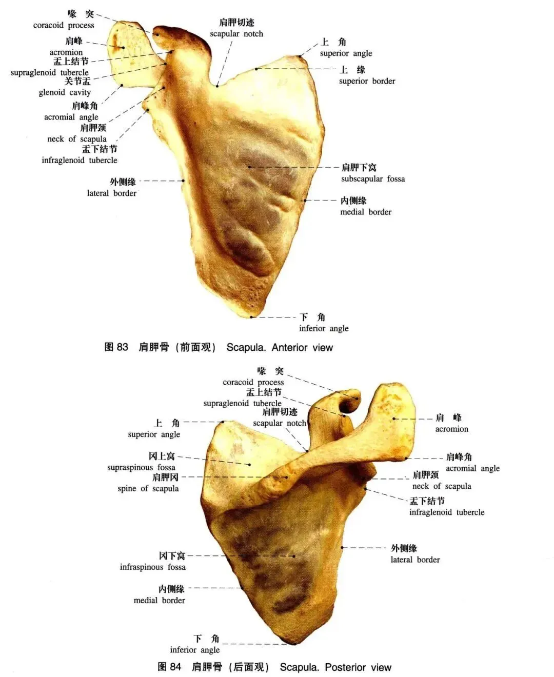 上缘短而薄,外侧有凸向前的指状突起,称喙突。内侧缘薄而锐利,因临近脊柱,故又称脊柱缘。外侧缘肥厚,临近腋窝称腋缘。上角为上缘与脊柱缘汇合处,平对第二肋。下角为脊柱缘与腋缘汇合处,平对第七肋。外侧角为腋缘与上缘汇合处,最肥厚,朝向外侧的梨形浅窝称关节盂,与肱骨头相关节。肩胛骨背面有一横嵴,称肩胛冈。肩胛冈向外侧延伸的扁平突起称肩峰,与锁骨外侧端相关节,称肩锁关节。肱骨为长管状骨,上端有朝向上后内方呈半球形的肱骨头,与肩胛骨的关节盂相关节。头周围的环状浅沟称解剖颈。肱骨头的外侧和前方有隆起的大结节和小结节,大小结节向下各延伸一嵴,两结节间有一纵沟称结节间沟。上端与体交界处稍细称外科颈,较易发生骨折。