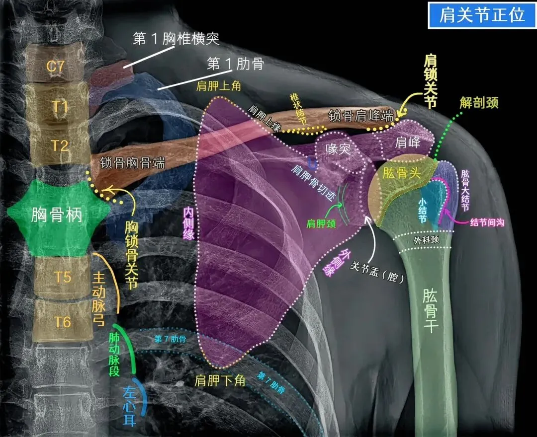 首先我们一起来复习一下肩关节X线的大体解剖结构。肩关节是全身最灵活的关节,由锁骨、肩胛骨和肱骨三块骨构成,主要形成盂肱关节。