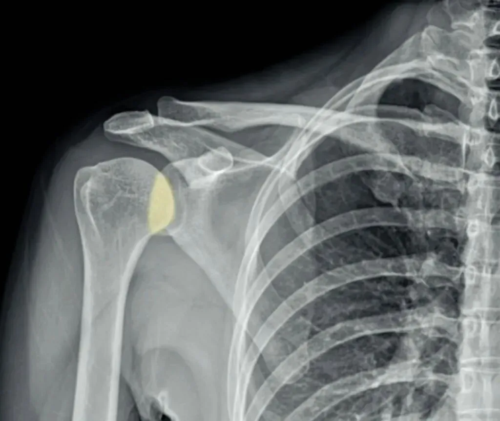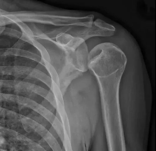 了解完肩关节X线解剖结构后,我们再来看正常的肩关节,肱骨头与关节盂是有部分重叠的,称为半月重叠征,或半月征。