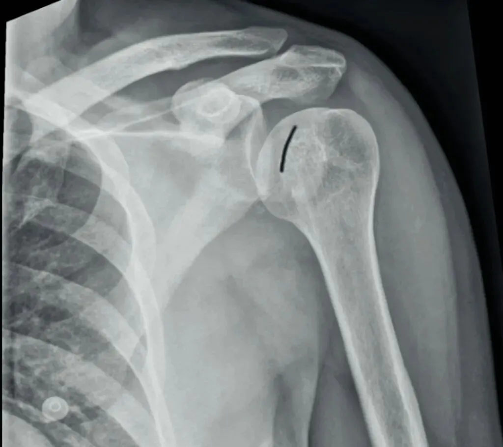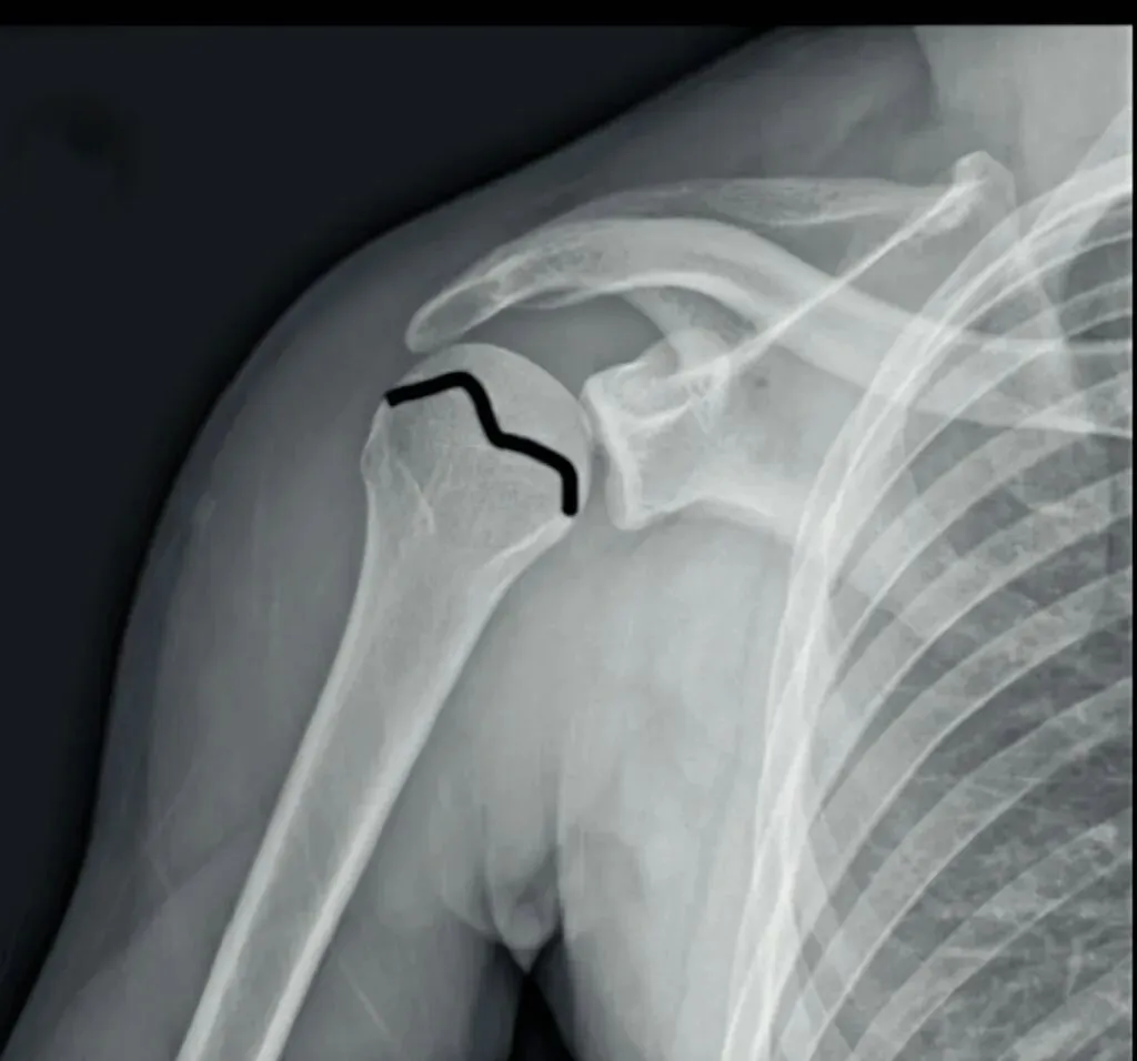其次,我们要注意外伤患者不仅有肩关节脱位,有时还会伴随骨折出现。有一个很典型的影像学表现就是槽线征,当肱骨头撞击关节盂后缘,骨质形成压缩性骨折,表现为肱骨头内侧骨皮质与反Hill-Sachs骨折块形成的近乎平行线,称槽线征。