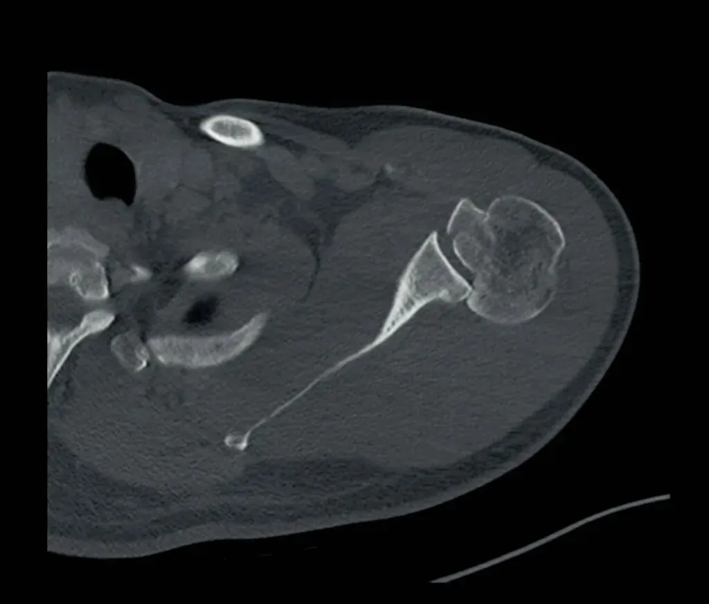 槽线征的识别对判断肱骨头内侧压缩性骨折至关重要。我们可以在肩关节的X线或者CT检查中清晰看到后脱位的肱骨头向关节窝的后方移位,同时也可显示肱骨头内侧受撞击形成的压缩性骨折(反Hill-Sachs骨折)。
