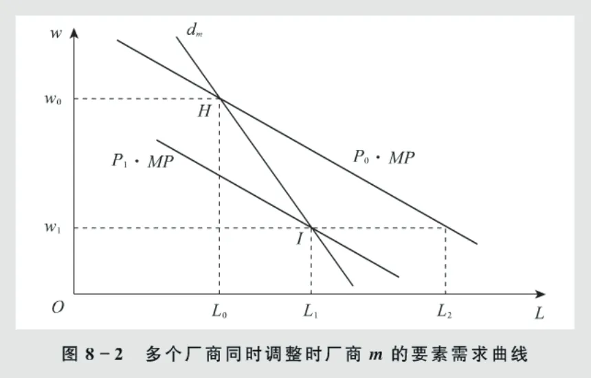 当多个厂商同时调整时,要素价格变化会导致行业产量变化,进而改变产品价格 P,使厂商的 VMP 曲线移动,此时厂商的要素需求曲线不再是 VMP 曲线,而是行业调整曲线dm。