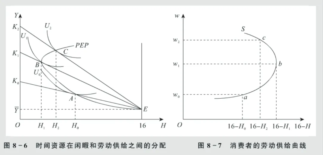 劳动供给是消费者对既定时间资源的分配:一天可自由支配时间为 16 小时(24 小时 - 8 小时必需睡眠),分为闲暇(H)和劳动供给(16-H),消费者实际是在闲暇(直接效用)和劳动收入(间接效用)之间选择。