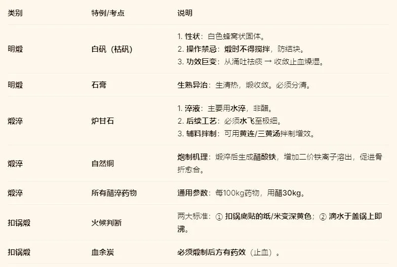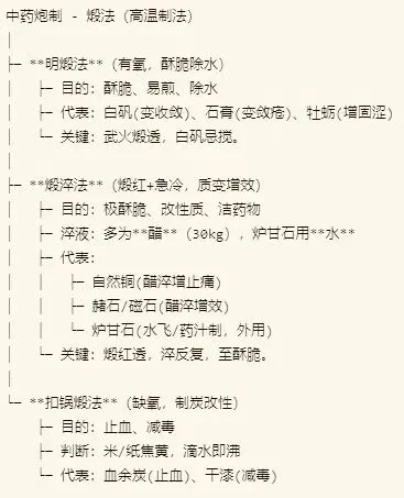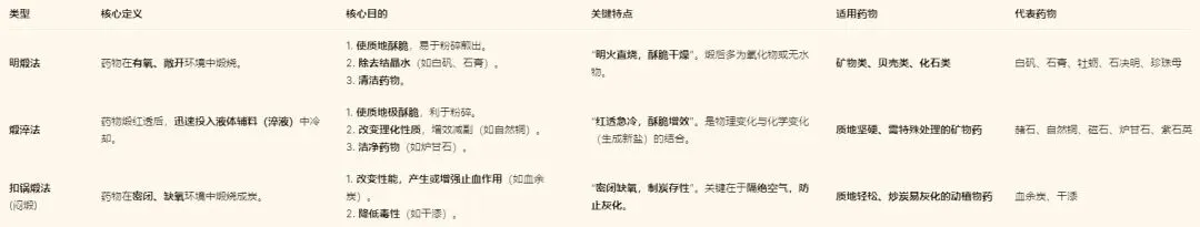 1.抓住核心区别:首先厘清三种煅法最根本的区别——是否有氧(明煅 vs 扣锅煅),以及是否急冷(煅淬)。这是逻辑起点。