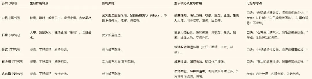 2.理解“质变”到“效变”:明煅的核心是物理变化(酥脆、脱水),煅淬是物理+化学变化(生成新盐如醋酸铁),扣锅煅是深度炭化。从这些变化推导出药效的改变。