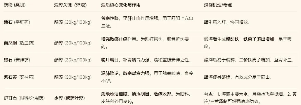 (2)煅淬:重点记自然铜(生成醋酸铁,增效)和炉甘石(特殊淬液:水飞细腻)。