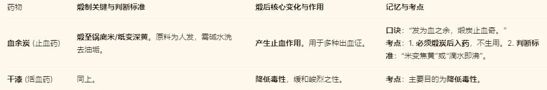 (3)扣锅煅:重点记血余炭(生品不可用,碳品可止血)。