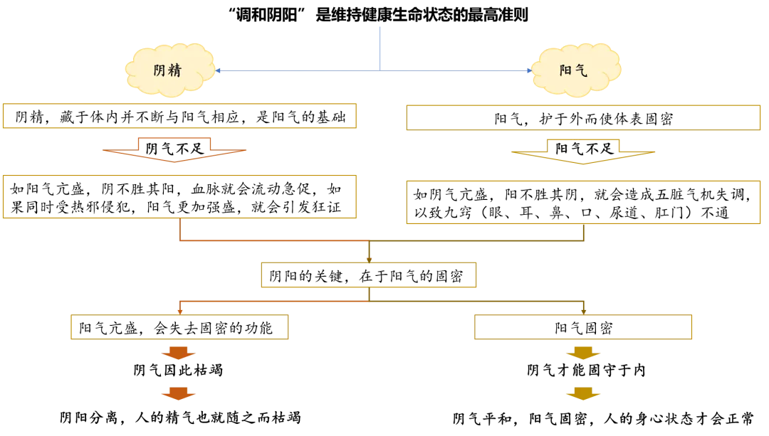 凡阴阳之要,阳密乃固。两者不和,若春无秋,若冬无夏。因而和之,是谓圣度。故阳强不能密,阴气乃绝;阴平阳秘,精神乃治;阴阳离决,精气乃绝。