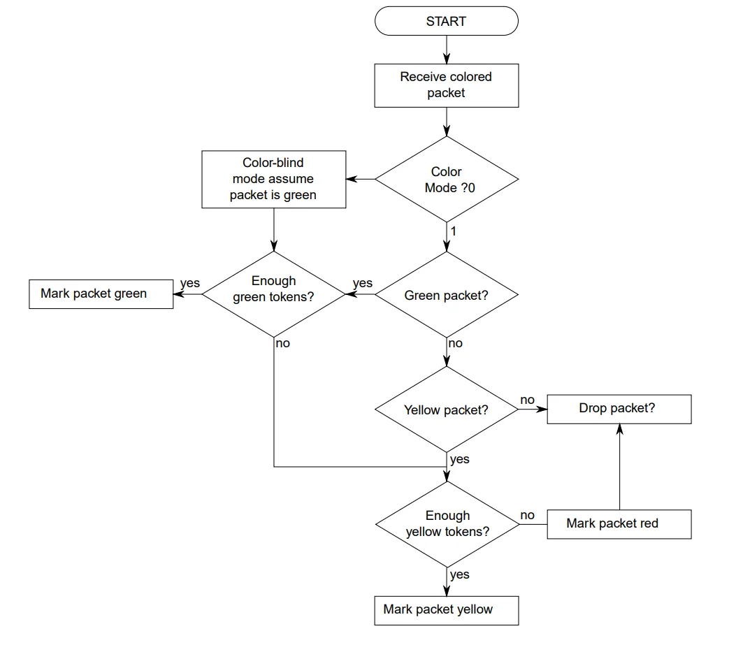 数据帧的颜色标记流程 当数据帧进入控制器时,系统会根据帧的大小消耗相应的令牌,并根据桶内令牌的余量对其进行颜色标记。以默认的色盲模式(Color-blind mode)为例,具体的判别流程如下