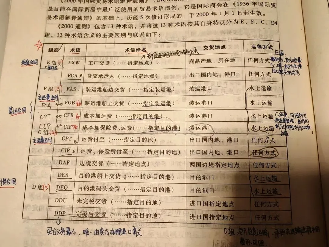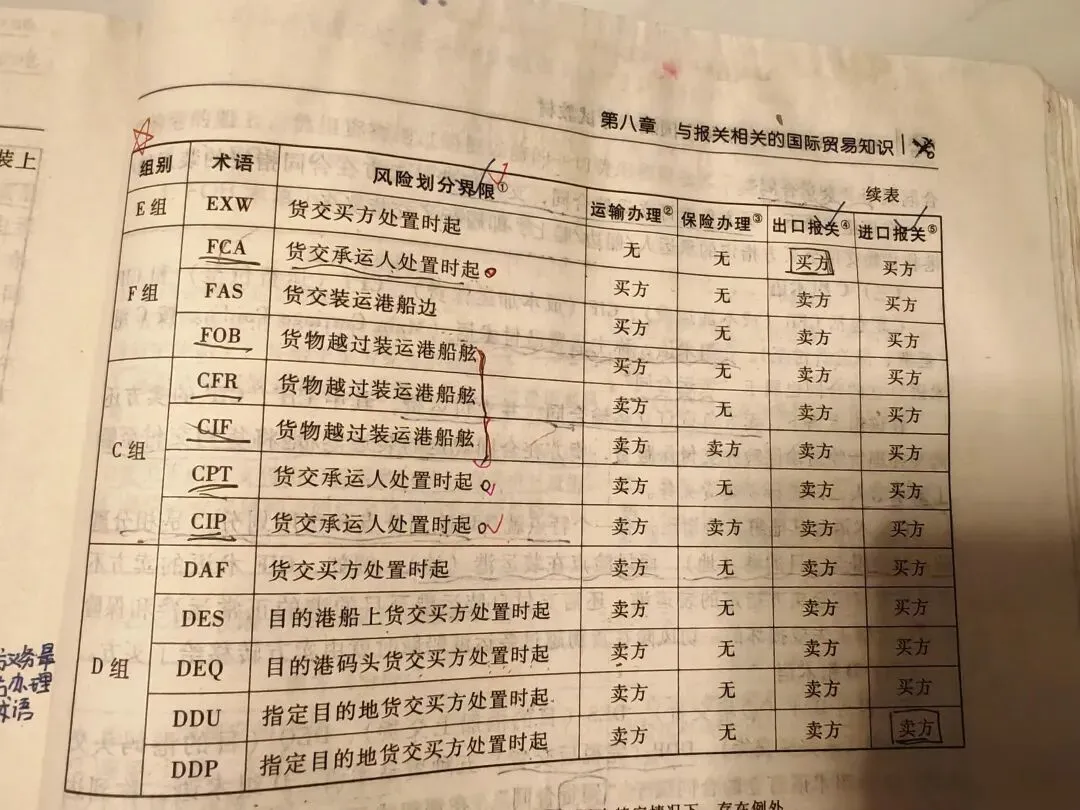 今天有朋友在跟我讨论,跟客户谈合同时,用哪种价格术语比较好。我又顺便拿出来多年前老报关员证时的教材,翻出了熟悉的笔记,也回想起了当年努力刷题考报关员的场景。😀😀😀