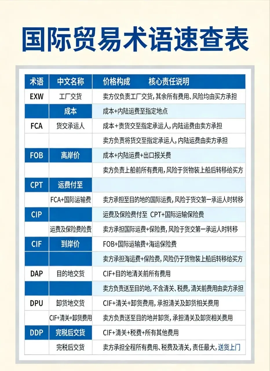 结合现在的资料,我也整理了常见的国际贸易术语,还请AI帮我生成了一张漂亮的海报图😛