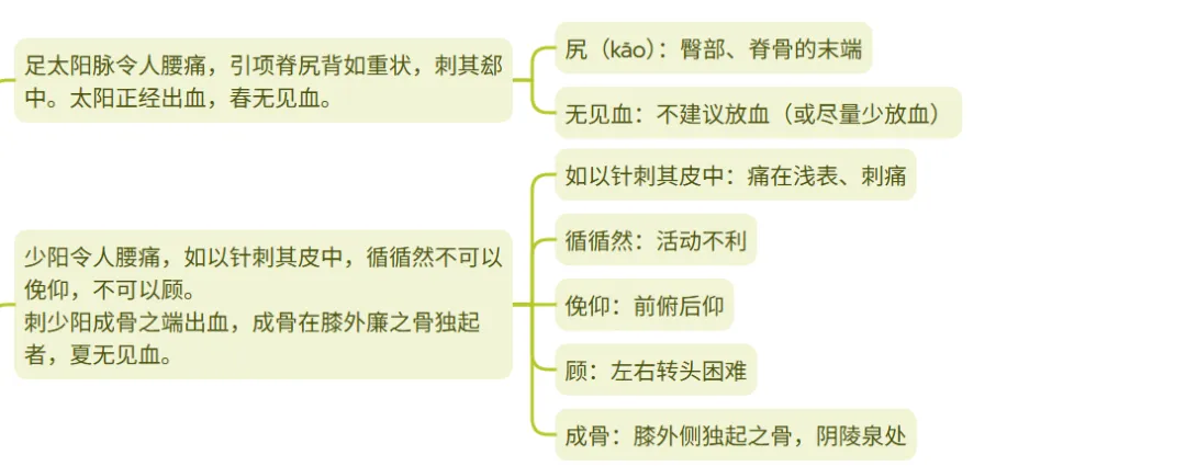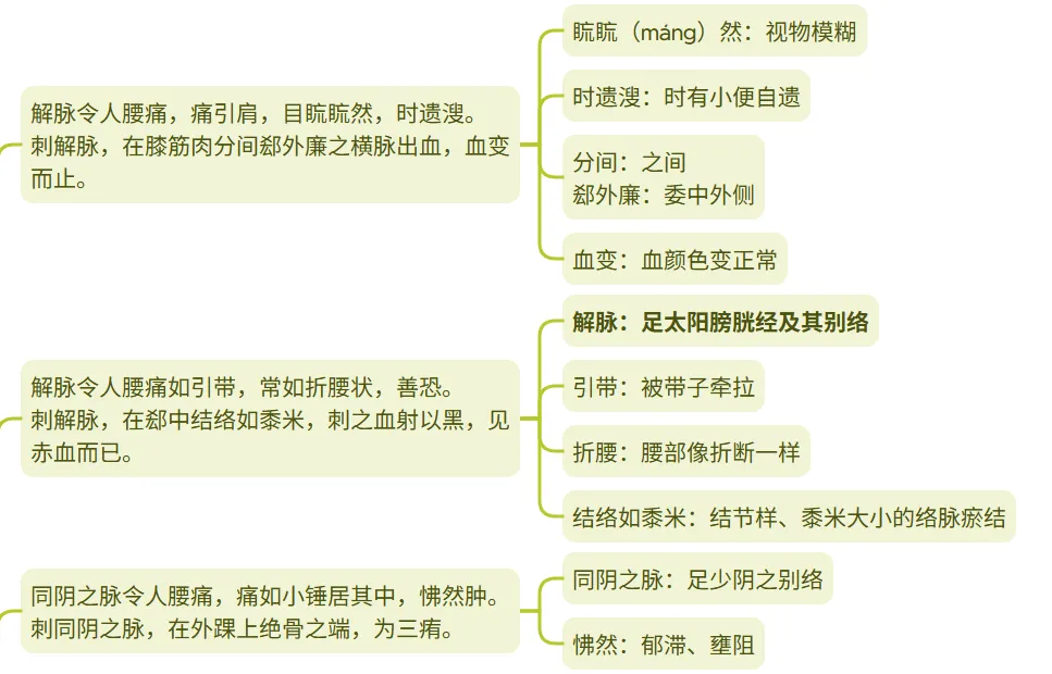 1、解脉:解脉腰痛,痛如被裂开,常伴有热感。解脉为足太阳经的分支,气血阻滞产生热象及疼痛。