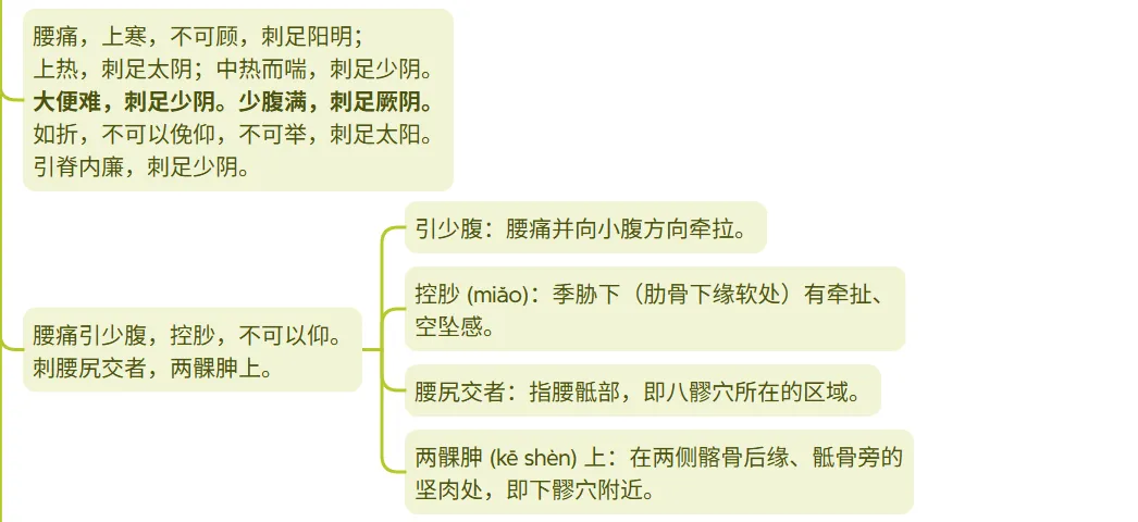症:腰痛如张弓弦,拘急强硬,妇女可见少腹、阴器相关