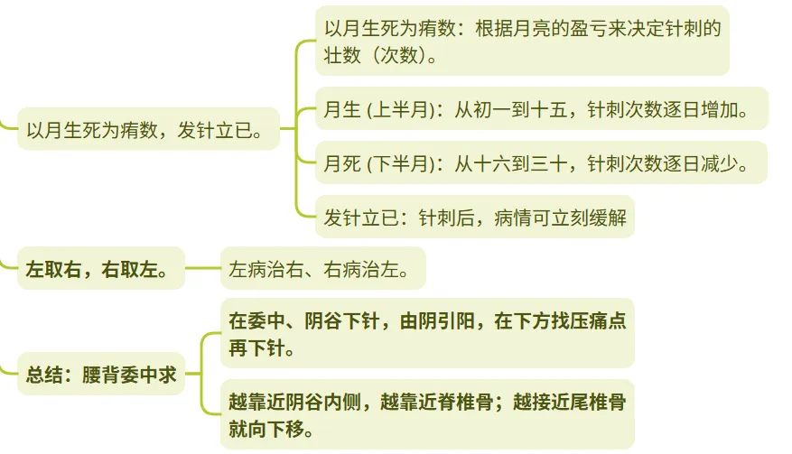 在委中、阴谷下针,由阴引阳,在下方找压痛点再下针。越靠近阴谷内侧,越靠近脊椎骨;越接近尾椎骨就向下移。