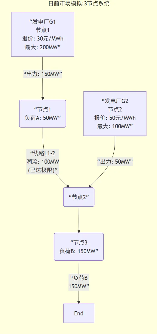·市场风险:如果G2是节点3附近唯一的可用机组,它可能会报出远高于50元的价格来获取超额利润,这就是电力交易中心设置报价上下限管制的原因。