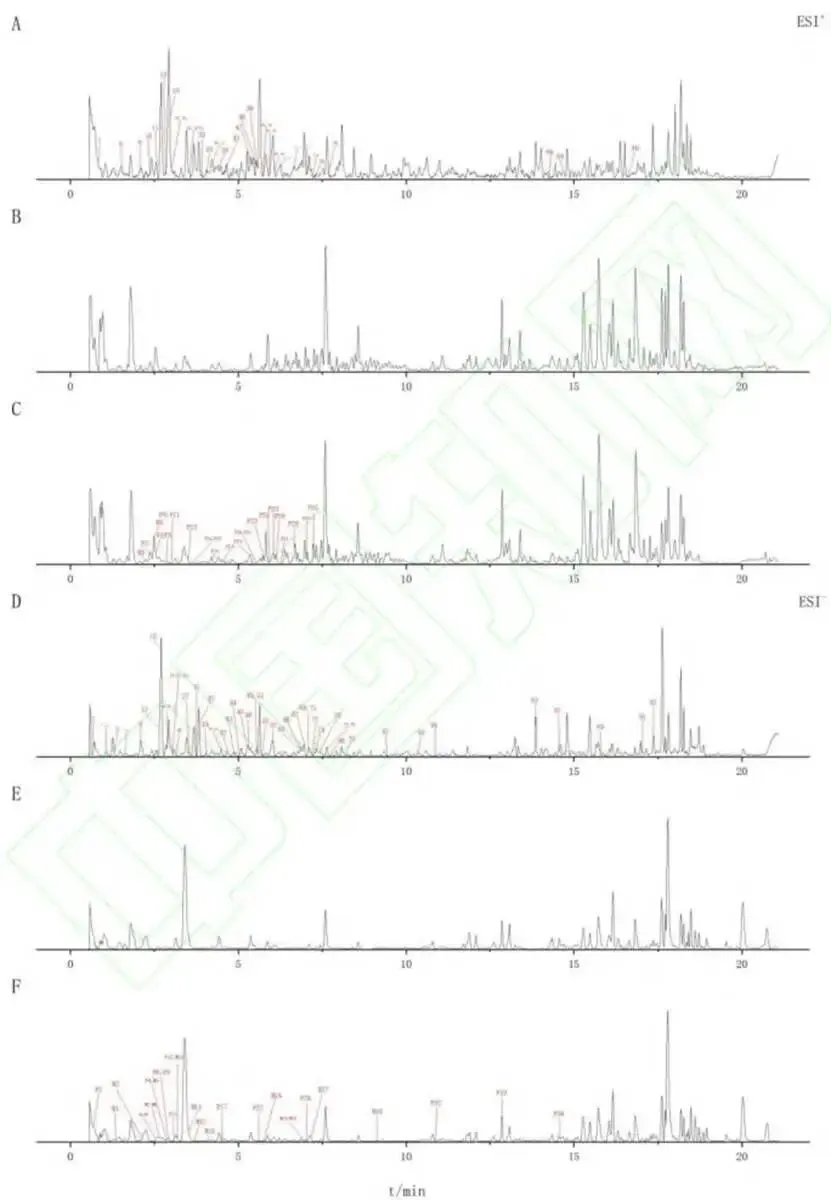 图 1 正离子 (A~C) 和负离子 (D~F) 模式下的总离子流图