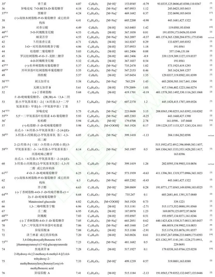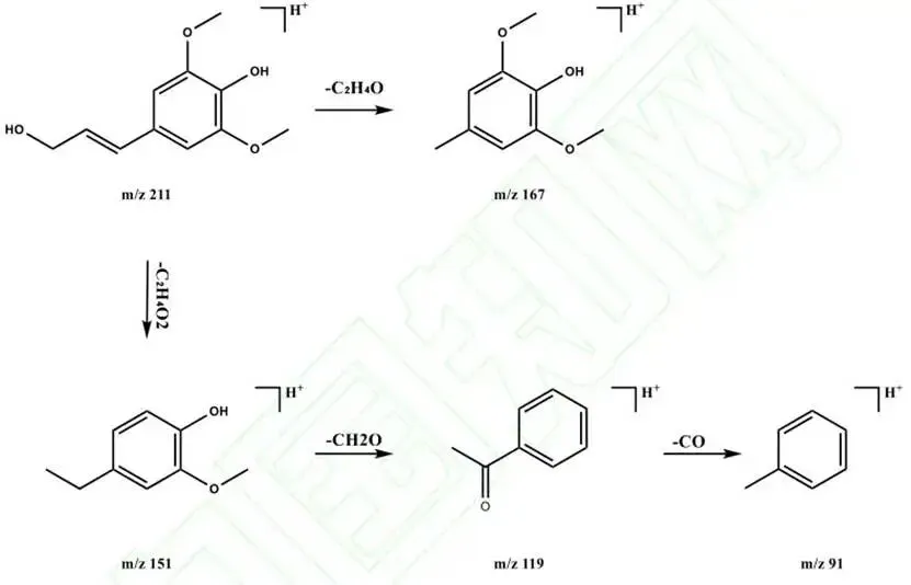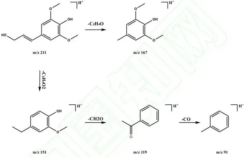u芥子醇(化合物 20):在正离子模式下,m/z 211 [M+H]⁺ 先发生侧链断裂生成 m/z 167,或协同丢失甲氧基与 CH₂OH 生成 m/z 151,随后继续丢失 CH₂O 和 CO 生成更小碎片 [[中药分析]]。