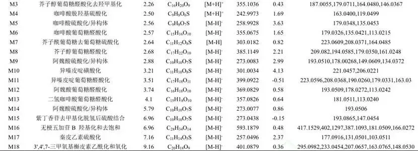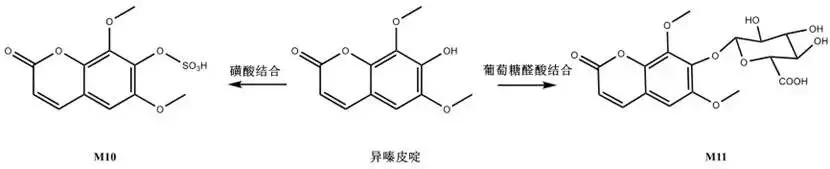 异嗪皮啶的 7-OH 位点易于发生Ⅱ相结合反应。代谢产物 M10 为磺酸化产物(m/z 增加 80),M11 为葡萄糖醛酸化产物(m/z 增加 176) [[中药分析]]。