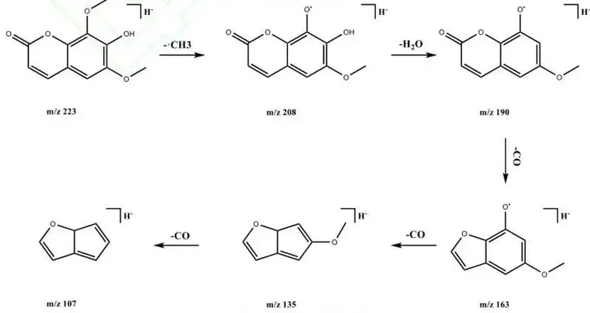 u秦皮乙素(化合物 16):在负离子模式下,准分子离子峰 m/z 177 [M-H]⁻ 首先丢失一分子 CO 生成 m/z 149 碎片,随后交替丢失 O 和 CO,依次生成 m/z 133、105 和 89 的特征碎片离子 [[中药分析]]。