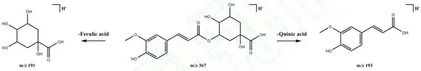 u阿魏酰基奎尼酸(化合物 19、40):在负离子模式下检测到 m/z 367 [M-H]⁻,裂解时主要产生两条路径:一是丢失阿魏酰基生成 m/z 191 [M-H-Ferulic acid]⁻;二是丢失奎宁酸生成 m/z 193 [M-H-Quinic acid]⁻ [[中药分析]]。
